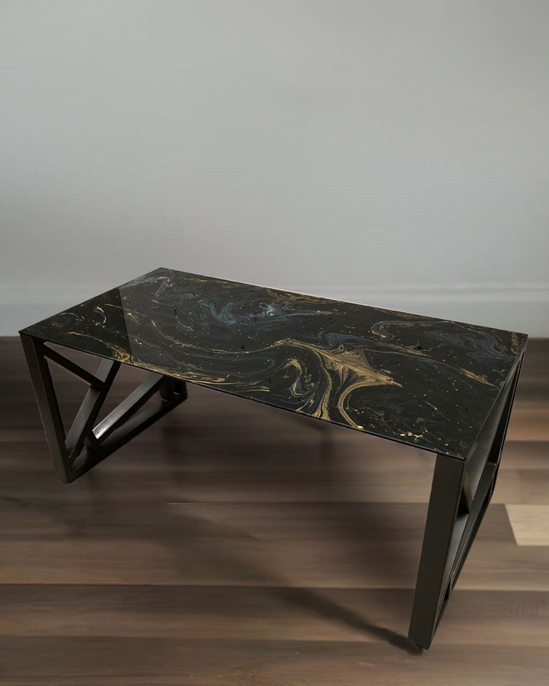 Escritorio de metal y cubierta de vidrio de 6 mm pintada a mano a base de una técnica de resinas.