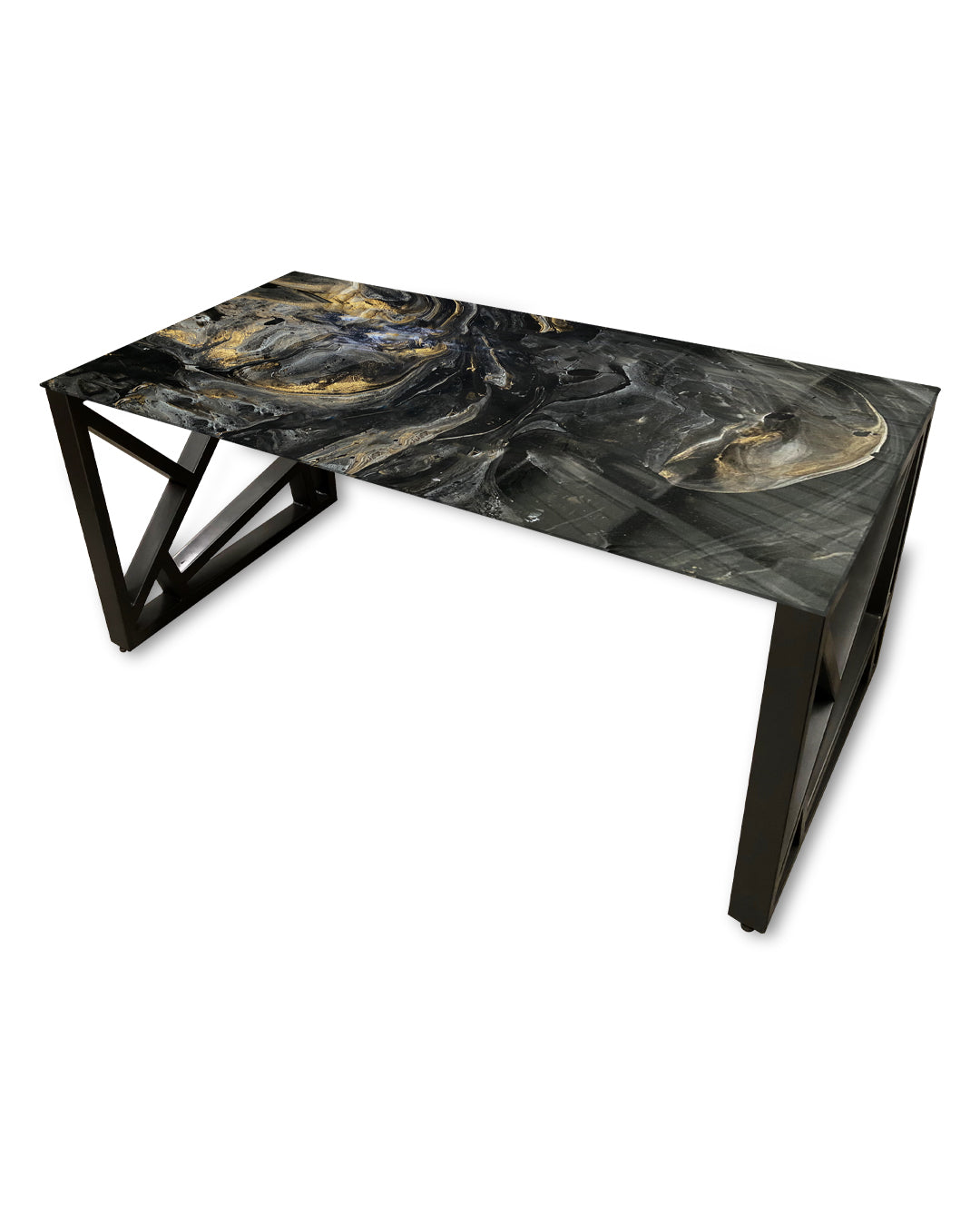 Escritorio de metal y cubierta de vidrio de 6 mm pintada a mano a base de una técnica de resinas.