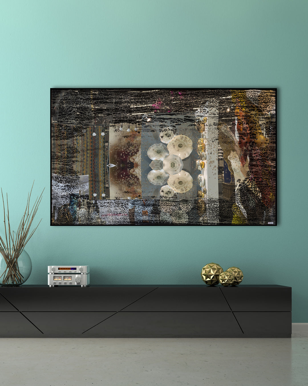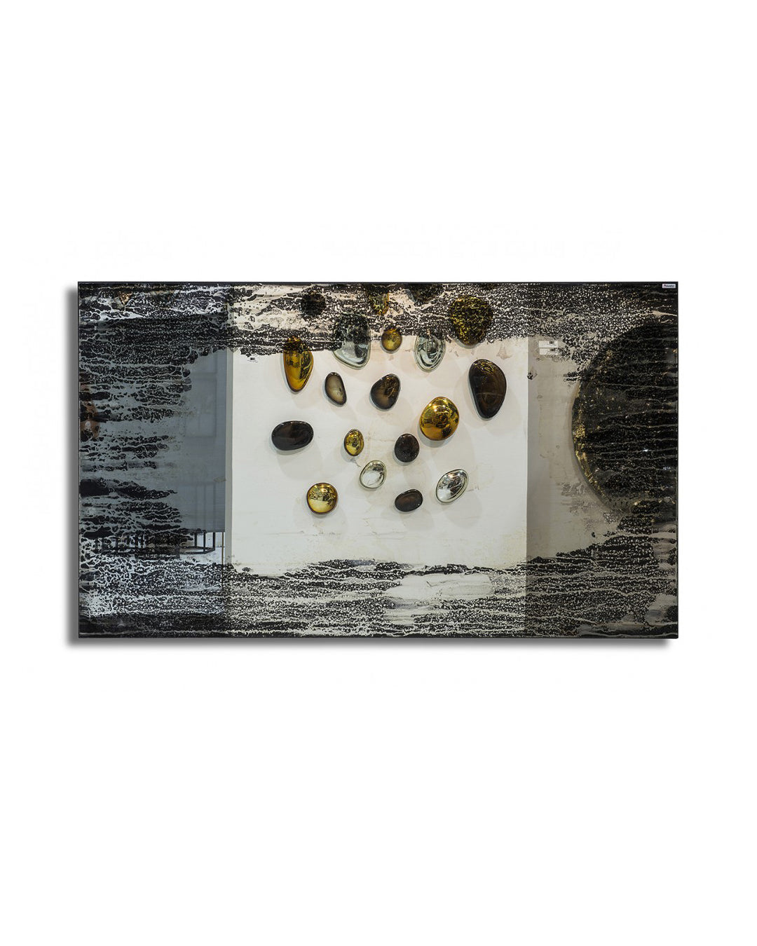Nuestro espejo pintado a mano a base de una técnica de resinas, montado sobre una base de metal color negro, es perfecto para elevar la decoración de tu hogar con sus acabados y colores elegantes.
