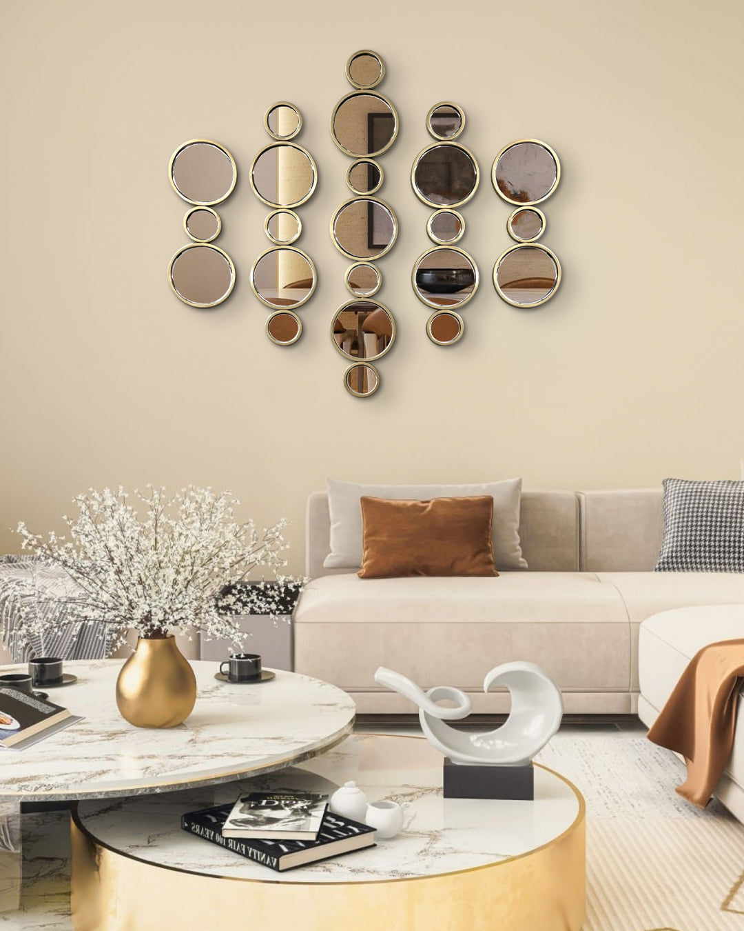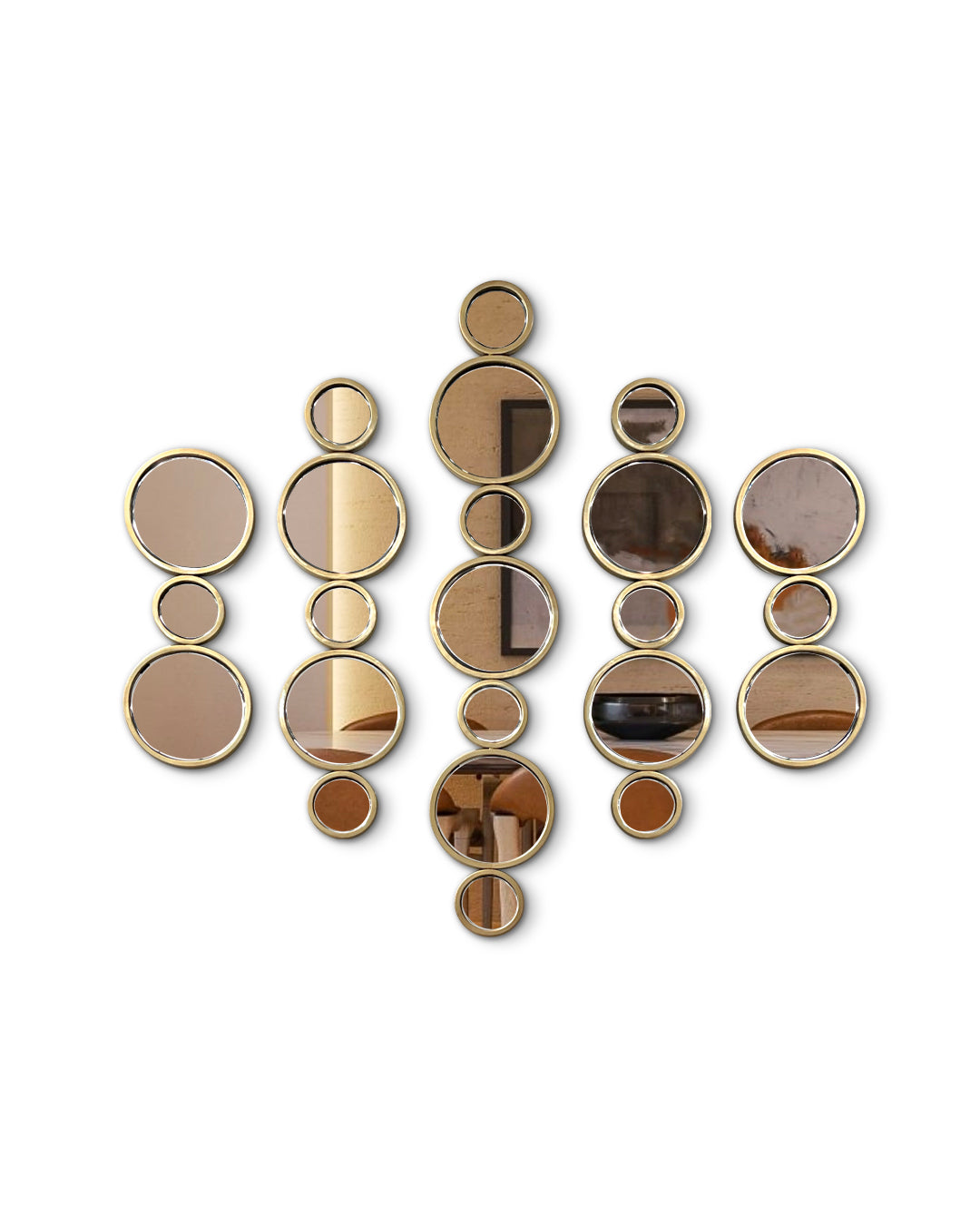 Siendo una pieza conformada de diámetros de diferentes tamaños, le otorga un aspecto encantador y divertido a tu ambiente sin perder la elegancia de los terminados. Este espejo llevará a otro nivel la decoración de tus espacios sin importar cuáles sean.