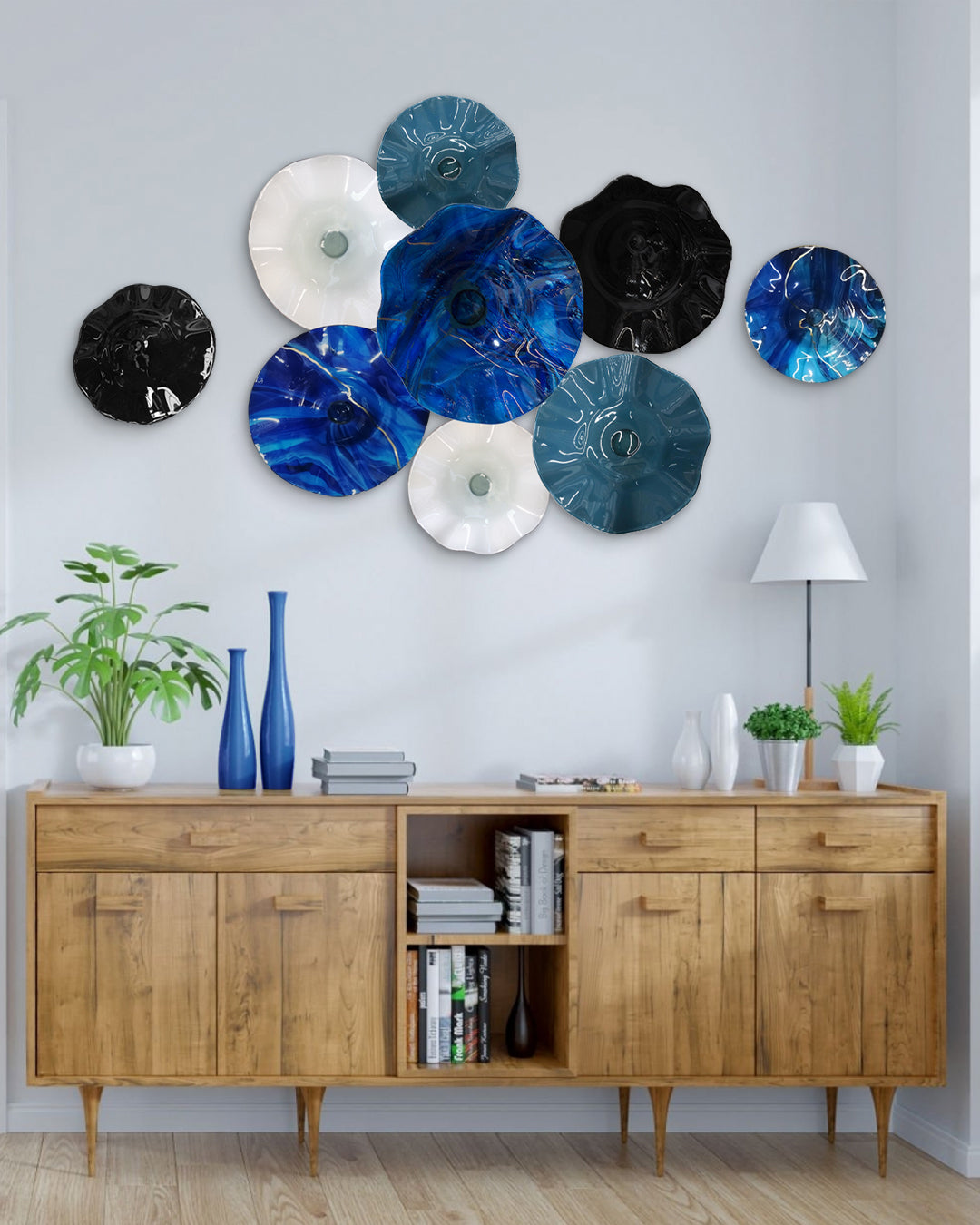 Con nuestro set de 9 platones de vidrio soplado podrás darle personalidad a tus espacios interiores gracias a sus distintas texturas y acabados originales, con sus diferentes combinaciones de color será posible crear ambientes especiales y visualmente atractivos que destacarán la belleza de su entorno en cualquier habitación, con la variación correcta destacarán la identidad de tu hogar.