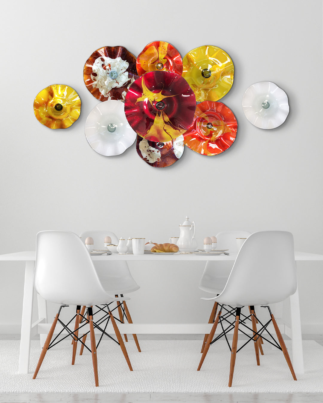 Con nuestro set de 9 platones de vidrio soplado podrás darle personalidad a tus espacios interiores gracias a sus distintas texturas y acabados originales, con sus diferentes combinaciones de color será posible crear ambientes especiales y visualmente atractivos que destacarán la belleza de su entorno en cualquier habitación, con la variación correcta destacarán la identidad de tu hogar.