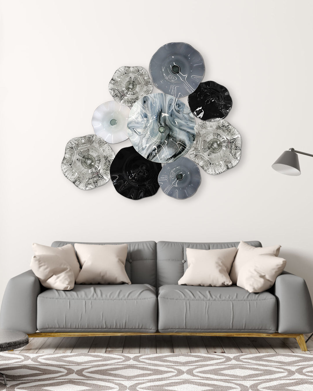 Con nuestro set de 9 platones de vidrio soplado podrás darle personalidad a tus espacios interiores gracias a sus distintas texturas y acabados originales, con sus diferentes combinaciones de color será posible crear ambientes especiales y visualmente atractivos que destacarán la belleza de su entorno en cualquier habitación, con la variación correcta destacarán la identidad de tu hogar.