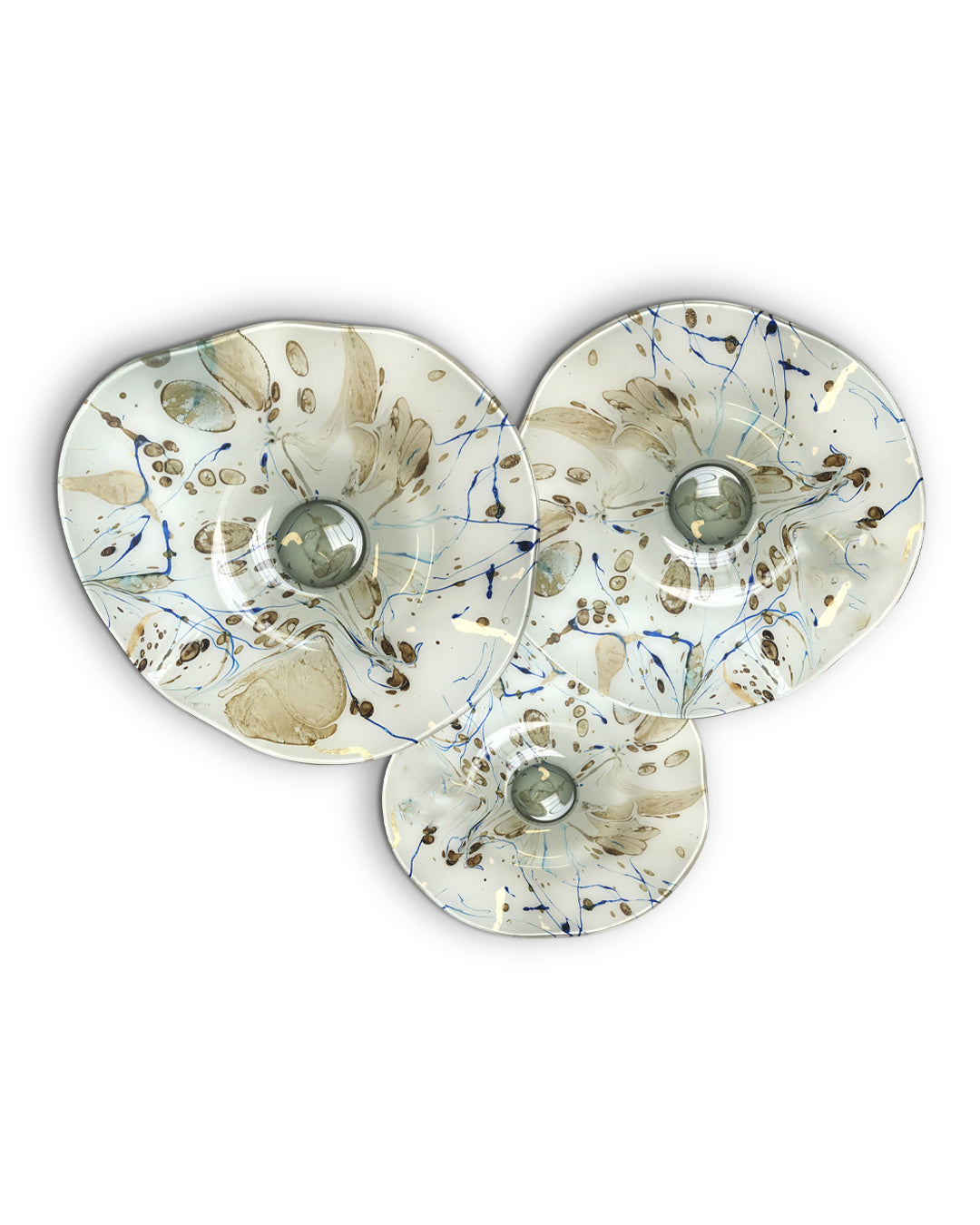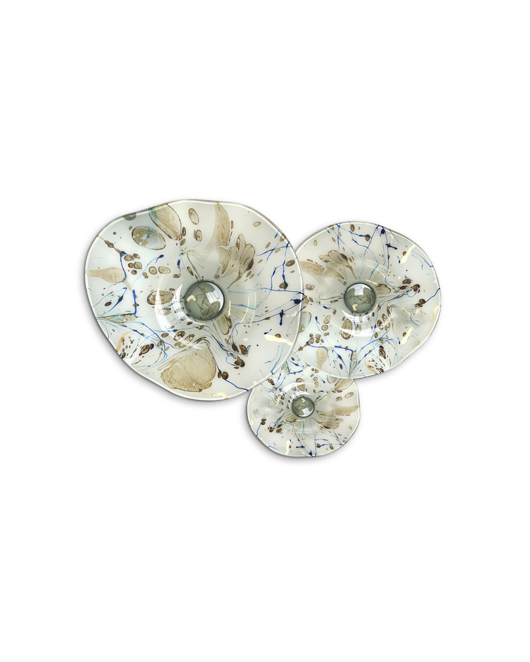Con nuestro juego de platones de vidrio soplado conseguirás darle el toque justo de color a tus espacios, con sus diferentes texturas y acabados originales podrás crear ambientes especiales y visualmente atractivos que destacarán la belleza de su entorno en cualquier habitación.