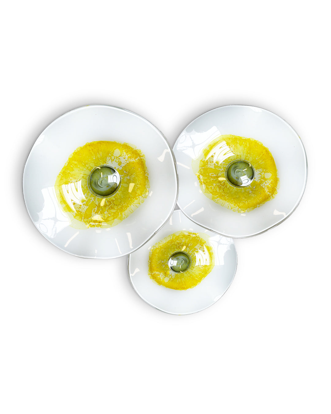 Con nuestro juego de platones de vidrio soplado conseguirás darle el toque justo de color a tus espacios, con sus diferentes texturas y acabados originales podrás crear ambientes especiales y visualmente atractivos que destacarán la belleza de su entorno en cualquier habitación.