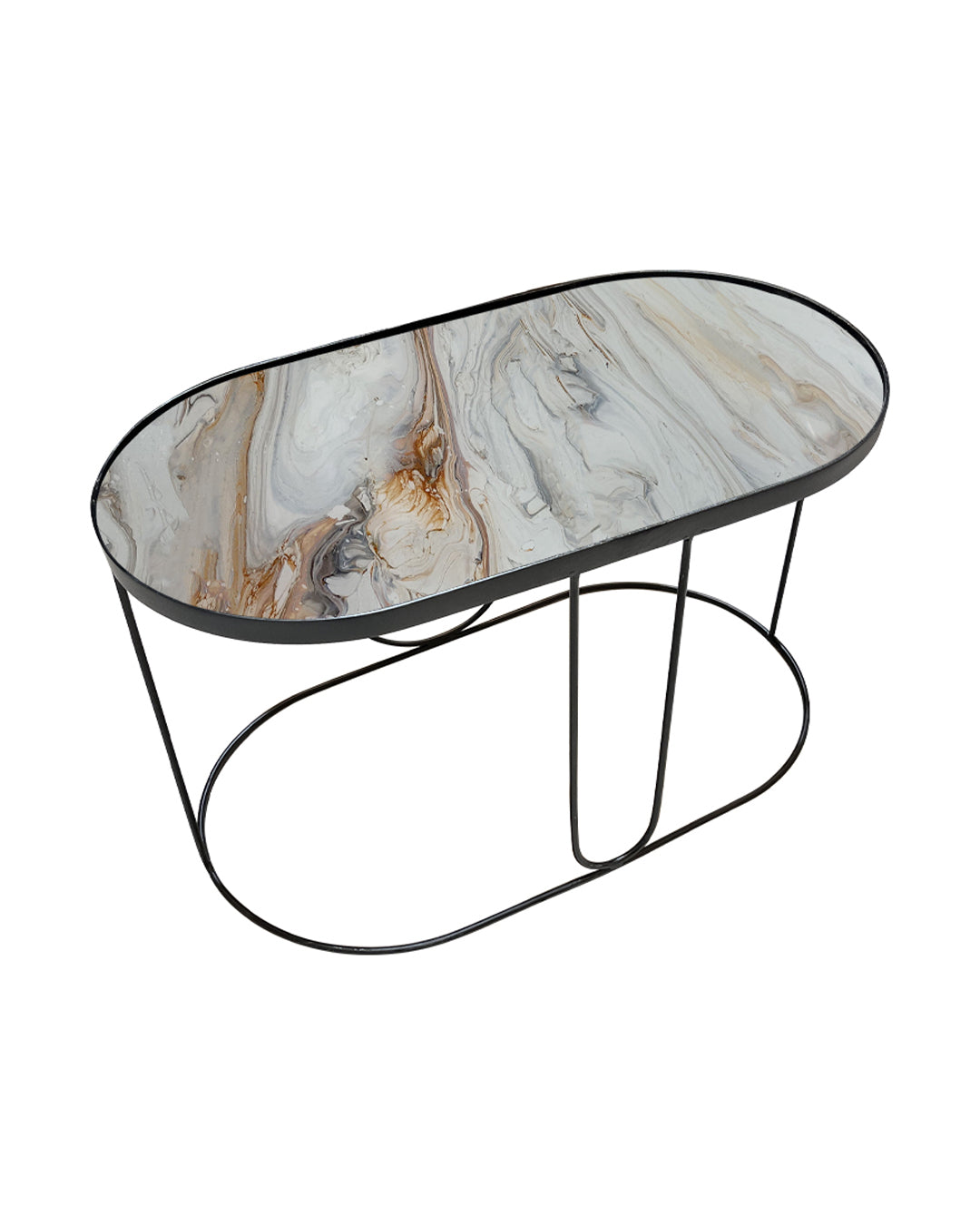 Elegante mesa decorativa de metal con cubierta de vidrio pintado a mano a base de una técnica de resinas.