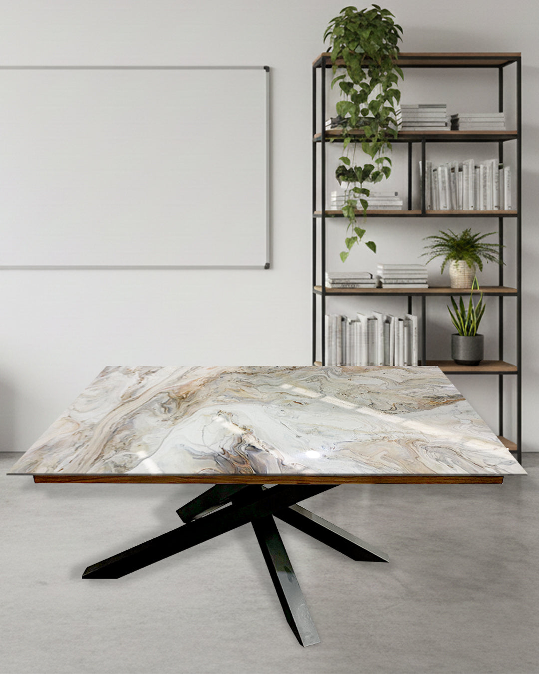 Mesa de juntas con base de metal y cubierta de vidrio de 6 mm pintada a mano a base de una técnica de resinas.