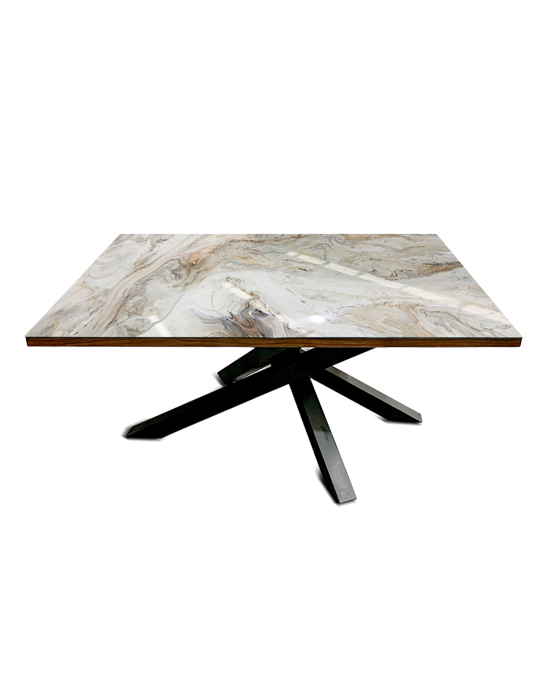 Mesa de juntas con base de metal y cubierta de vidrio de 6 mm pintada a mano a base de una técnica de resinas.
