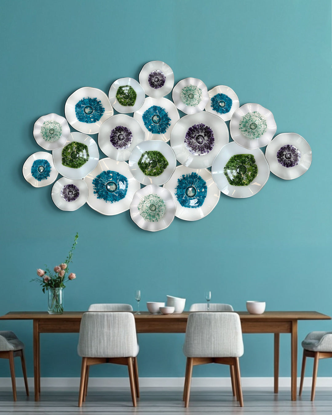 Con nuestro set de 19 platones de vidrio soplado podrás darle personalidad a tus espacios interiores gracias a sus distintas texturas y acabados originales, con sus diferentes combinaciones de color será posible crear ambientes especiales y visualmente atractivos que destacarán la belleza de su entorno en cualquier habitación, con la variación correcta destacarán la identidad de tu hogar.