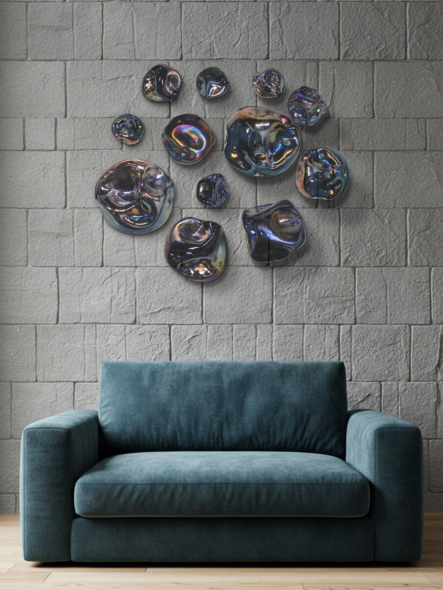Esferas deformes de vidrio soplado pintado a mano con bases individuales de metal.
