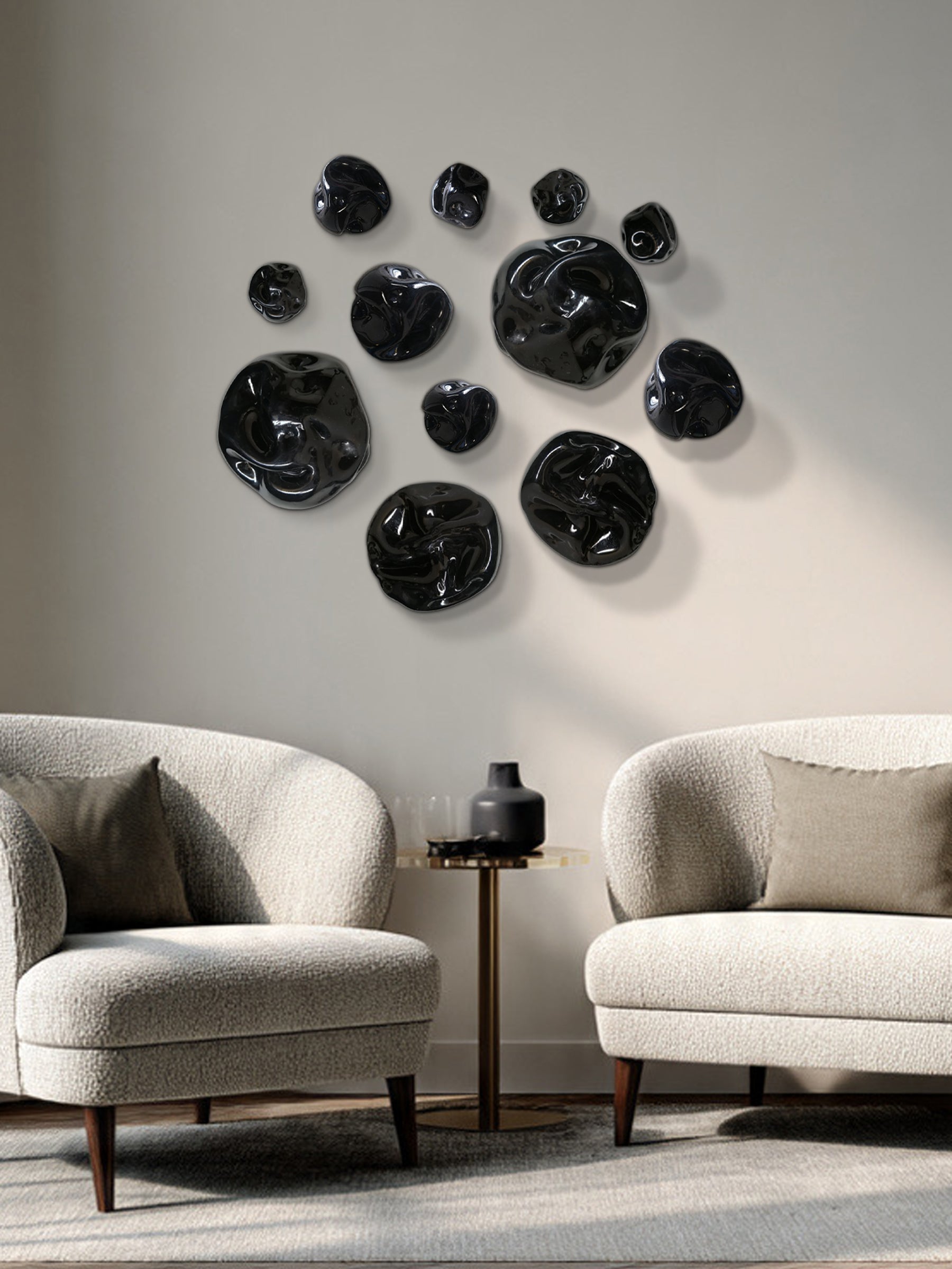 Esferas deformes de vidrio soplado pintado a mano con bases individuales de metal.