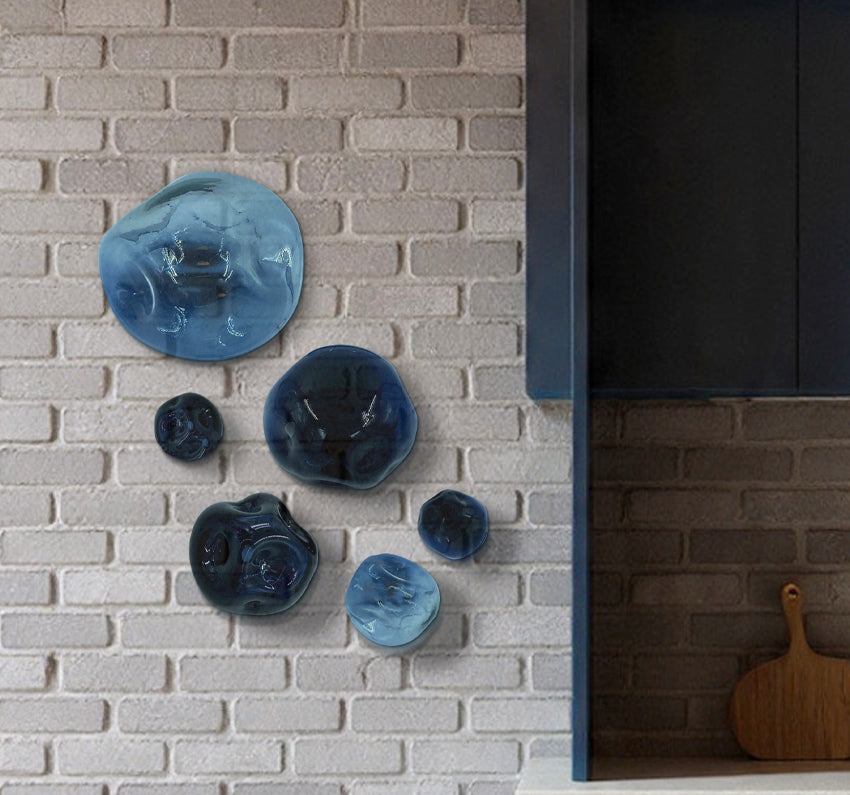 Esferas deformes de vidrio soplado pintado a mano con bases individuales de metal.