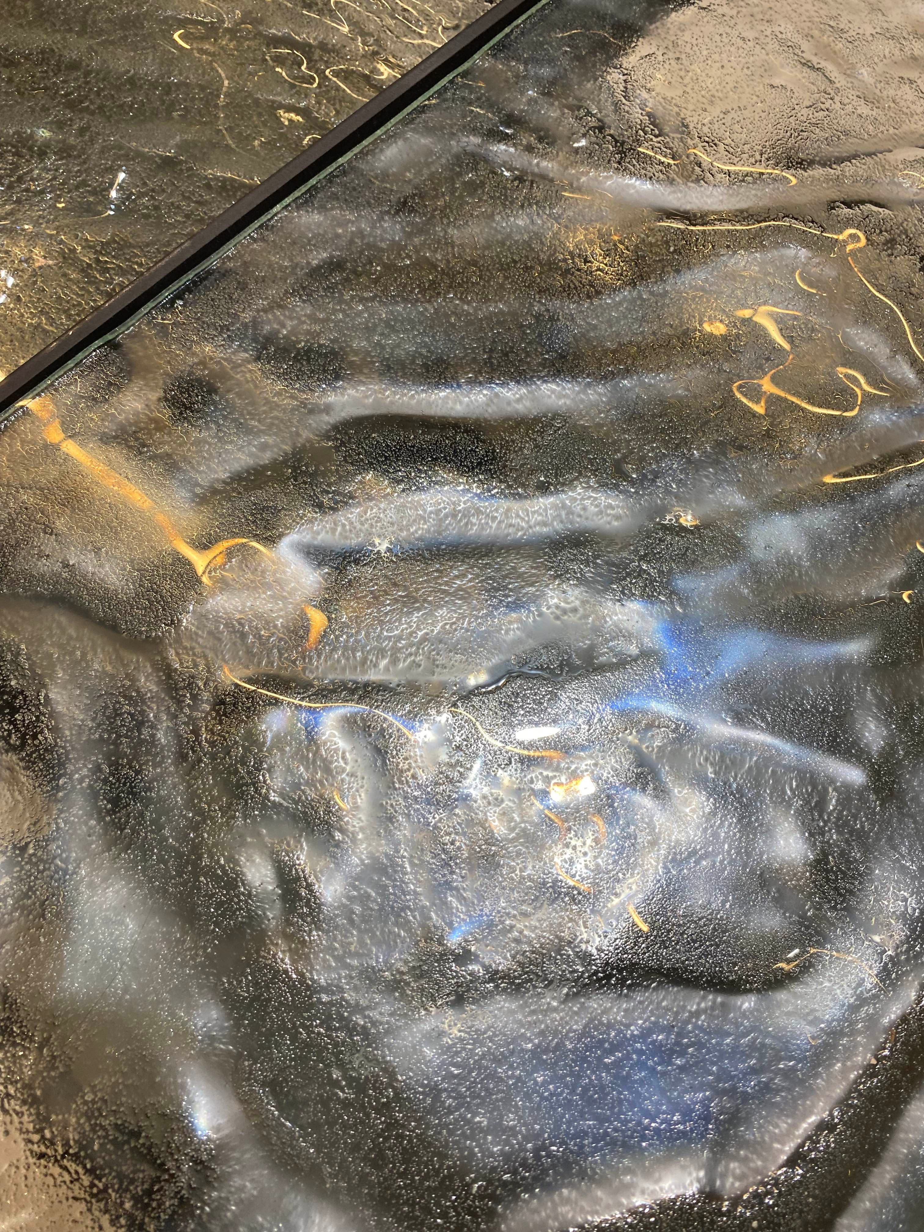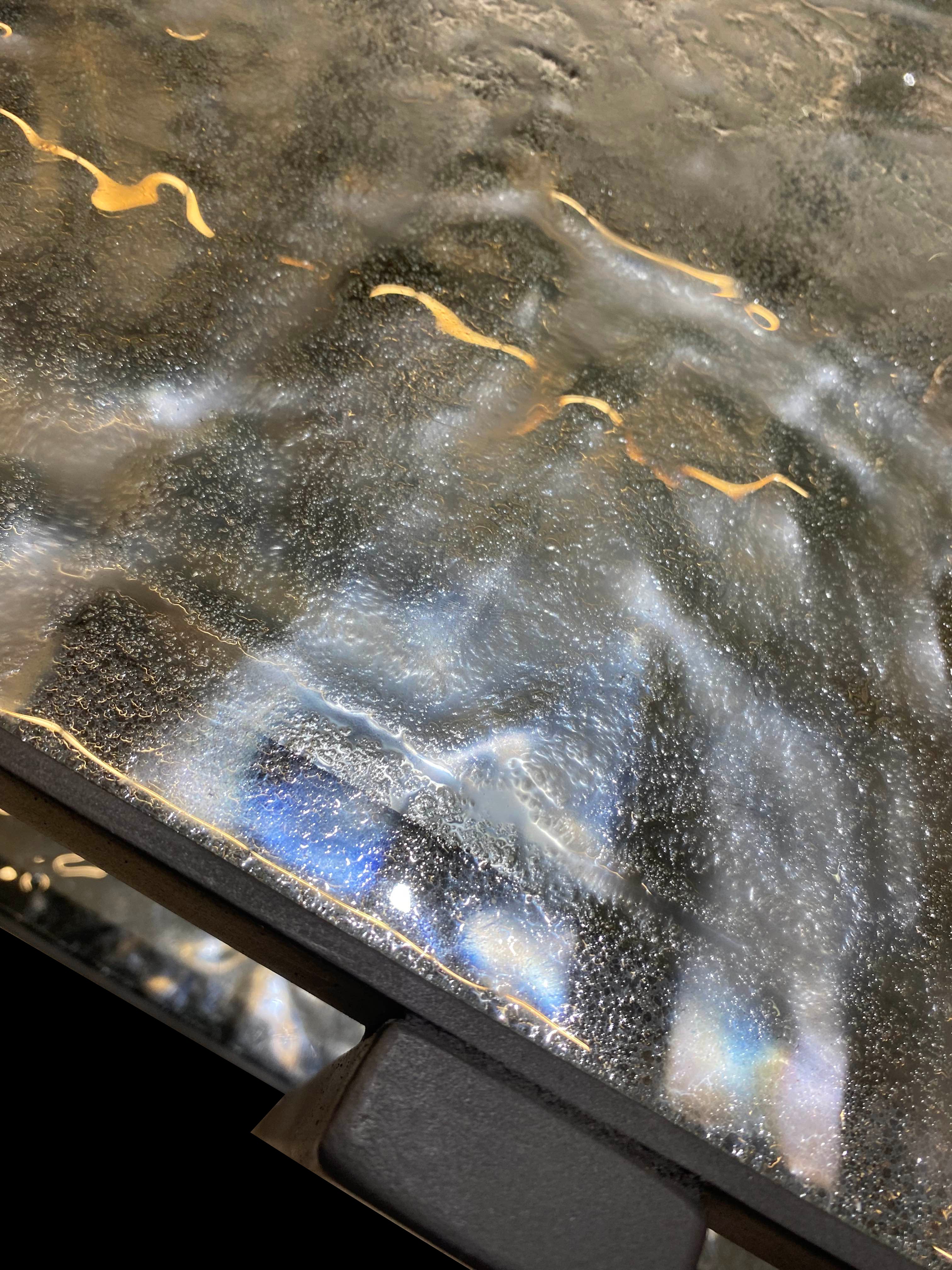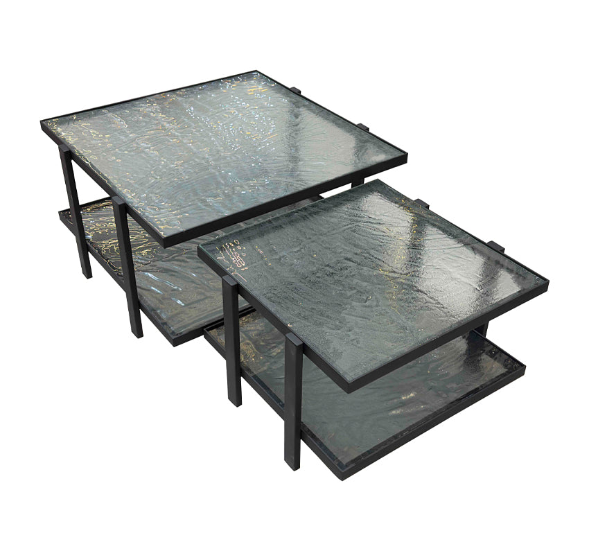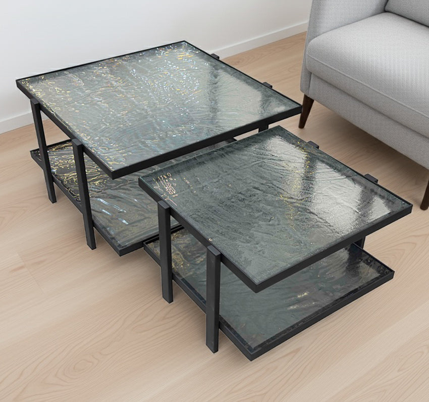 Elegante set de mesas decorativas de metal con cubierta de vidrio termoformado.