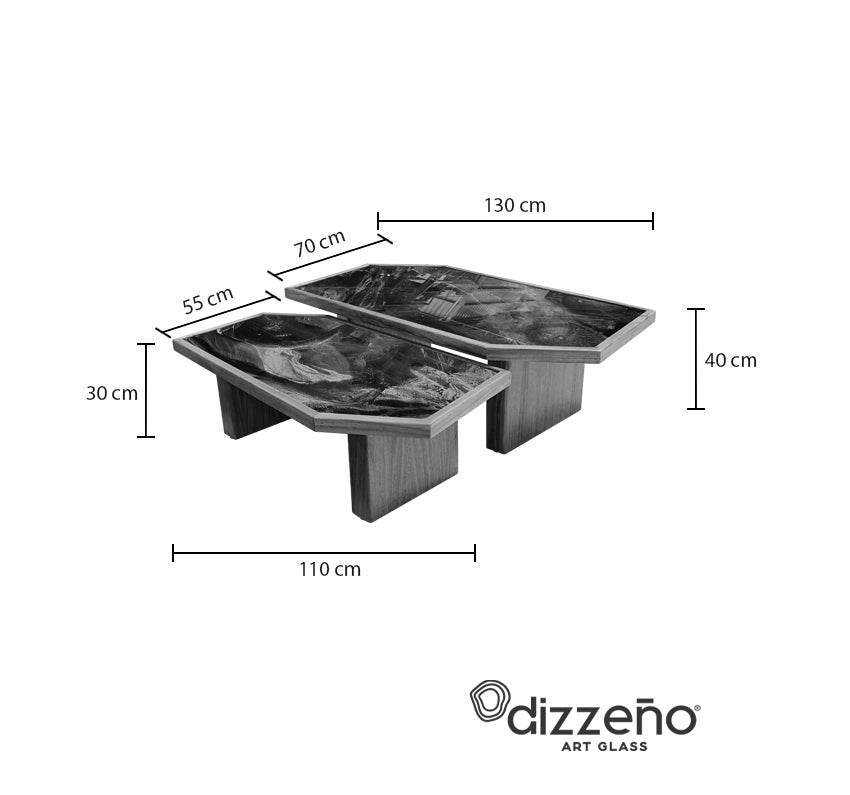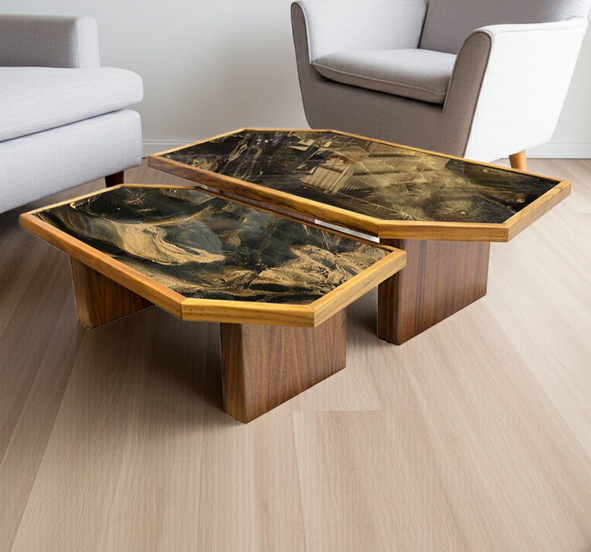 Elegante set de mesas decorativas de parota con cubierta de vidrio pintado a mano a base de una técnica de resinas.
