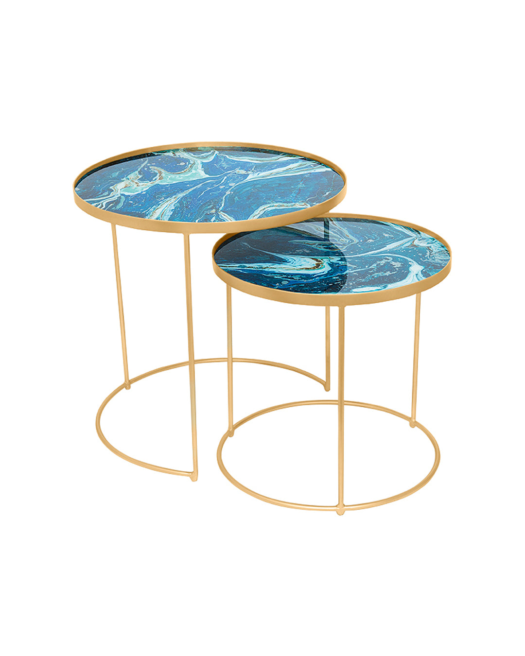 Elegante set de mesas decorativas de metal con cubierta de vidrio pintado a mano a base de una técnica de resinas.