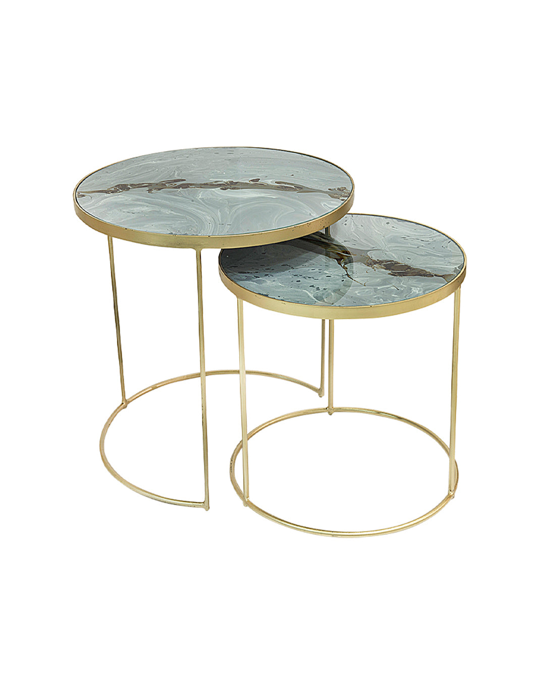 Elegante set de mesas decorativas de metal con cubierta de vidrio pintado a mano a base de una técnica de resinas.
