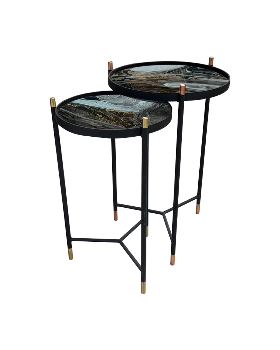 Elegante set de mesas decorativas de metal con cubierta de vidrio pintado a mano a base de una técnica de resinas.