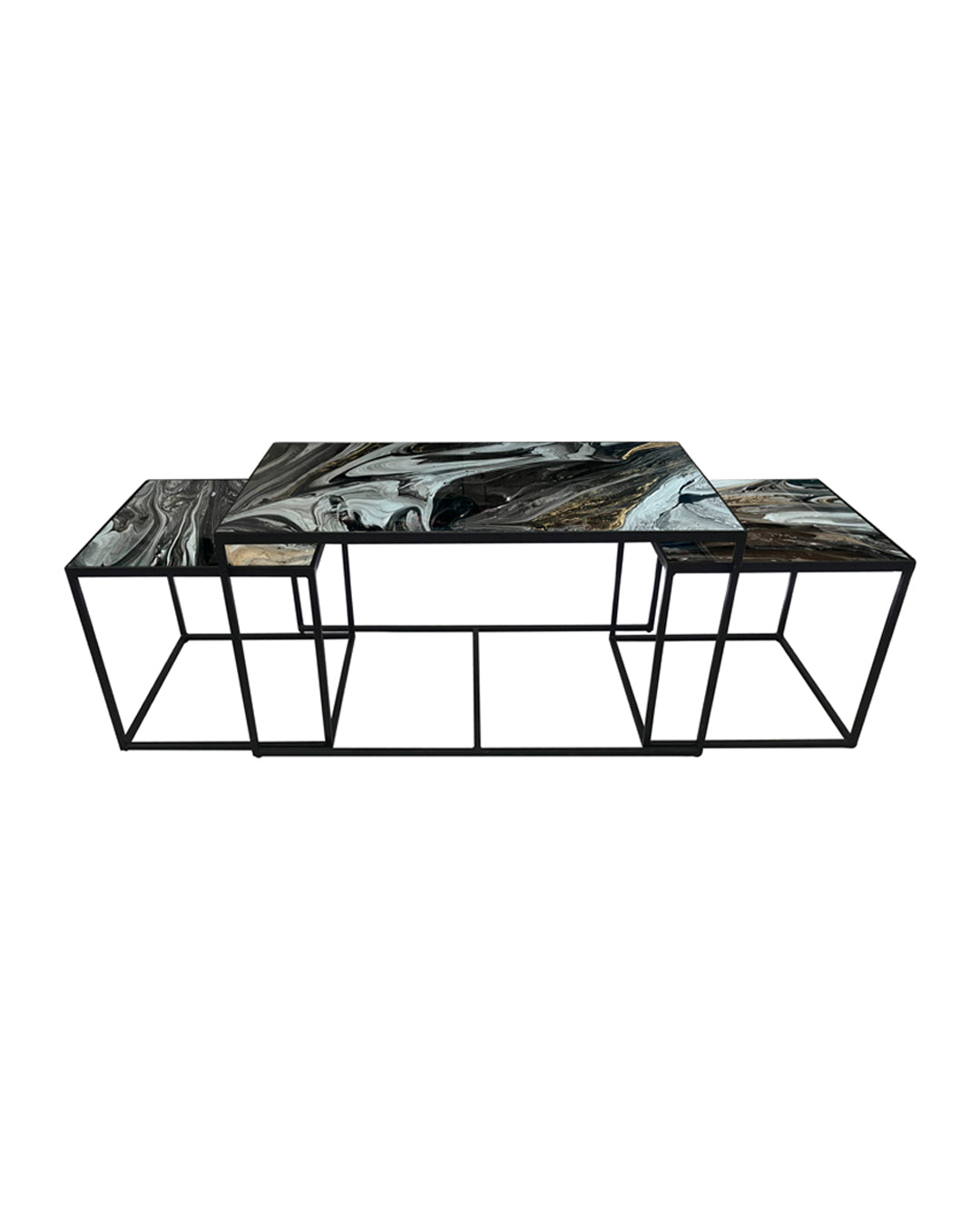 Elegante set de mesas decorativas de metal con cubierta de vidrio pintado a mano a base de una técnica de resinas.