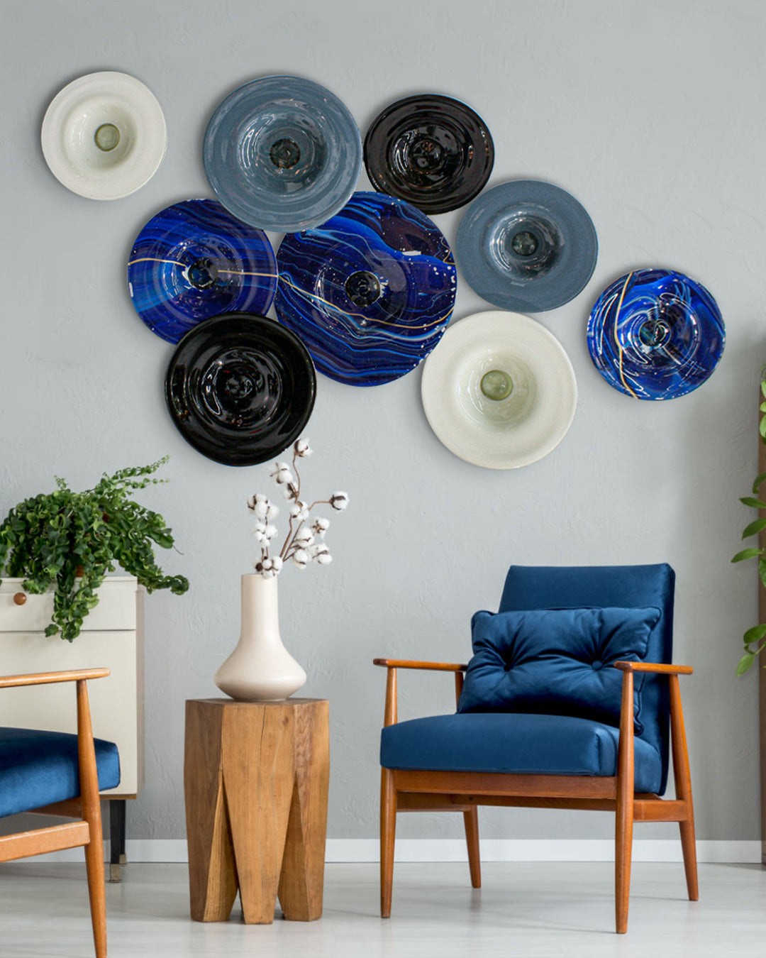 Con nuestro set de 9 platones de vidrio soplado podrás darle personalidad a tus espacios interiores gracias a sus distintas texturas y acabados originales, con sus diferentes combinaciones de color será posible crear ambientes especiales y visualmente atractivos que destacarán la belleza de su entorno en cualquier habitación, con la variación correcta destacarán la identidad de tu hogar.