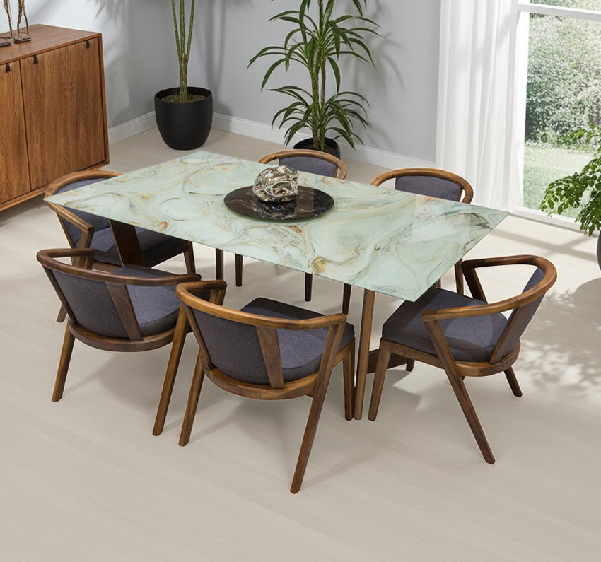 Elegante comedor con cubierta de vidrio pintado a mano a base de una técnica de resinas, patas de parota y 6 sillas cómodas que le aportan personalidad.
