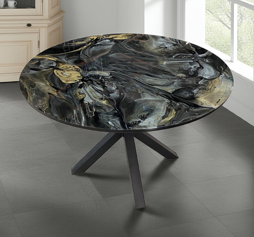Elegante mesa de comedor con cubierta de vidrio pintado a mano a base de una técnica de resinas y patas de metal negro mate.