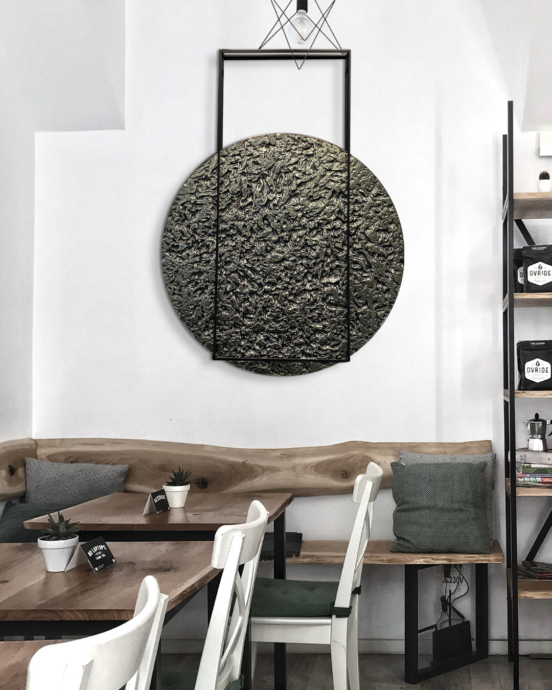 Diámetro de vidrio termoformado de 6 mm pintado a mano a base de una técnica de resinas, sobre una base de metal color negro mate.