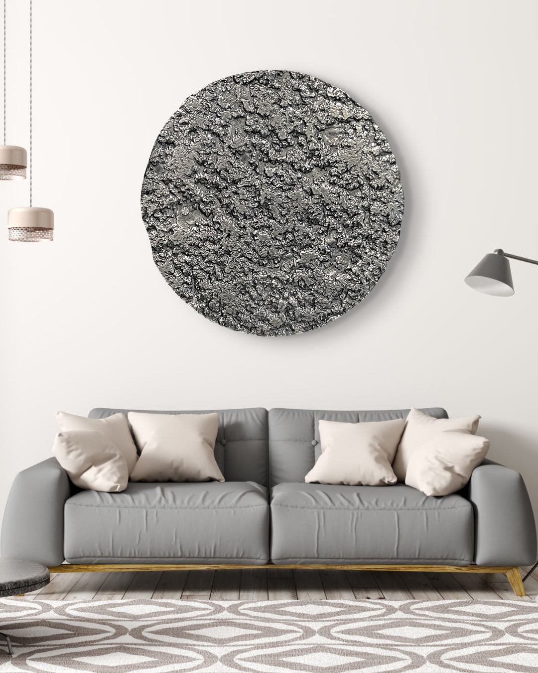 Círculo de vidrio termoformado de 6 mm pintado a mano a base de una técnica de resinas.