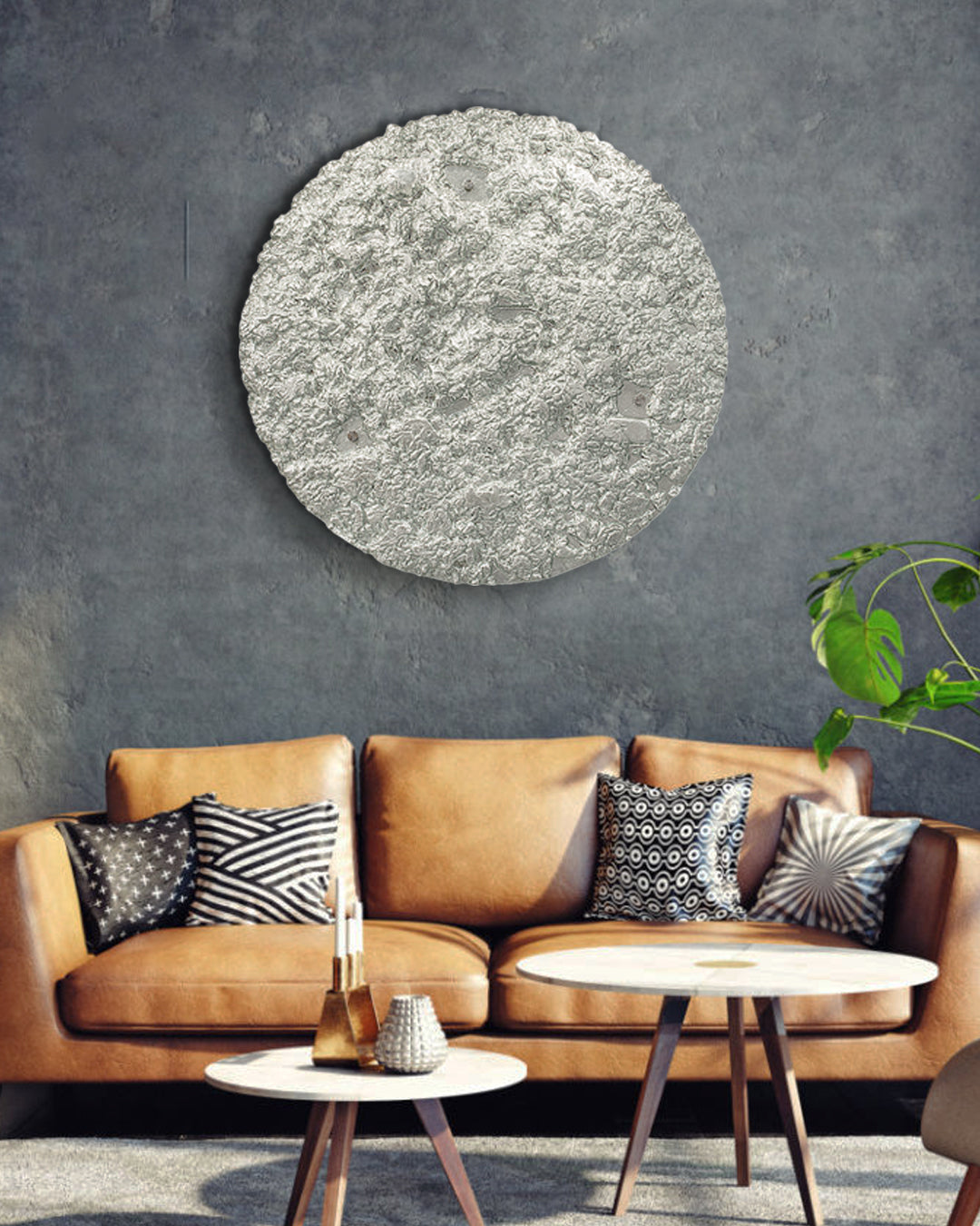 Círculo de vidrio termoformado de 6 mm pintado a mano a base de una técnica de resinas.