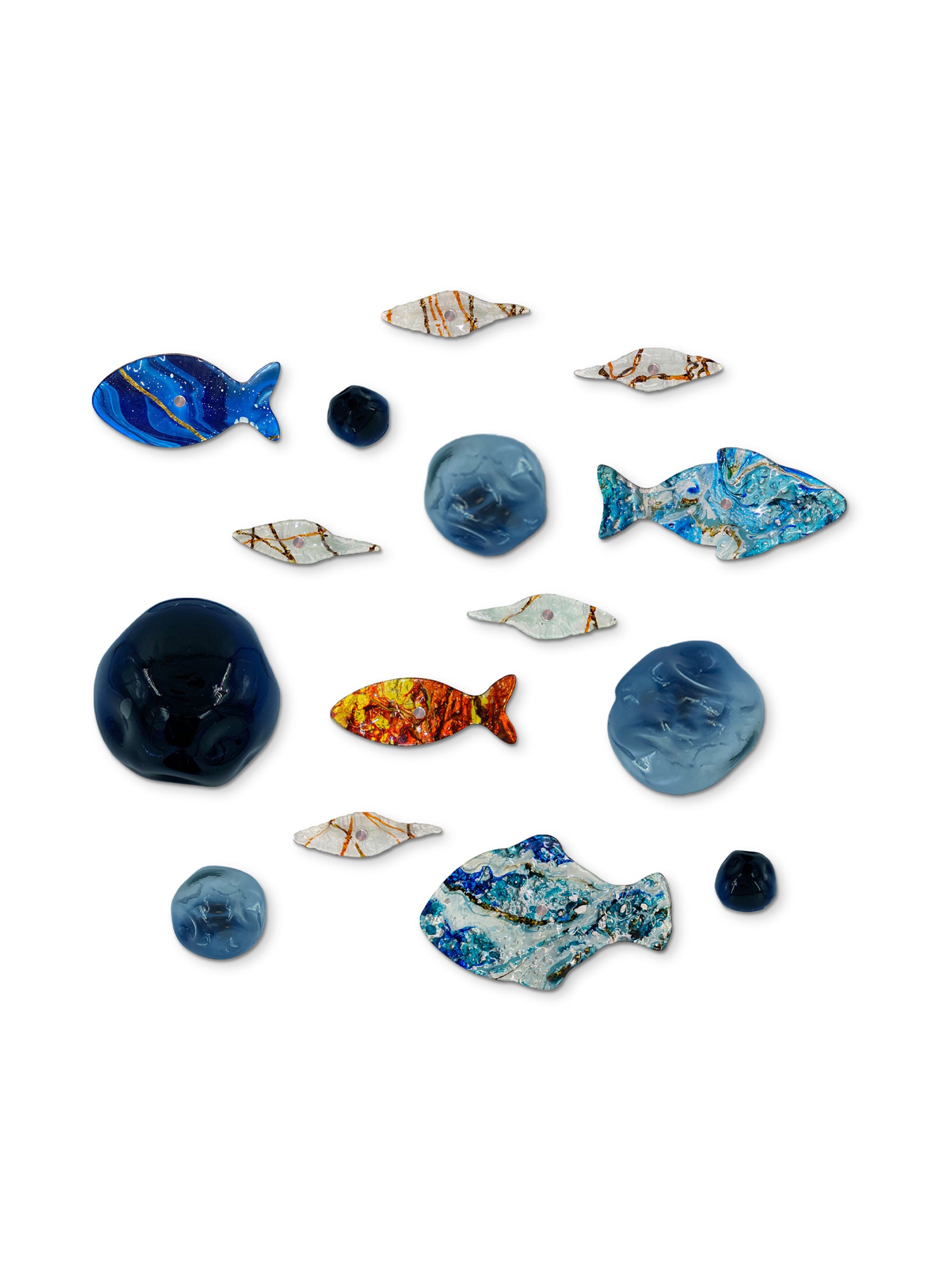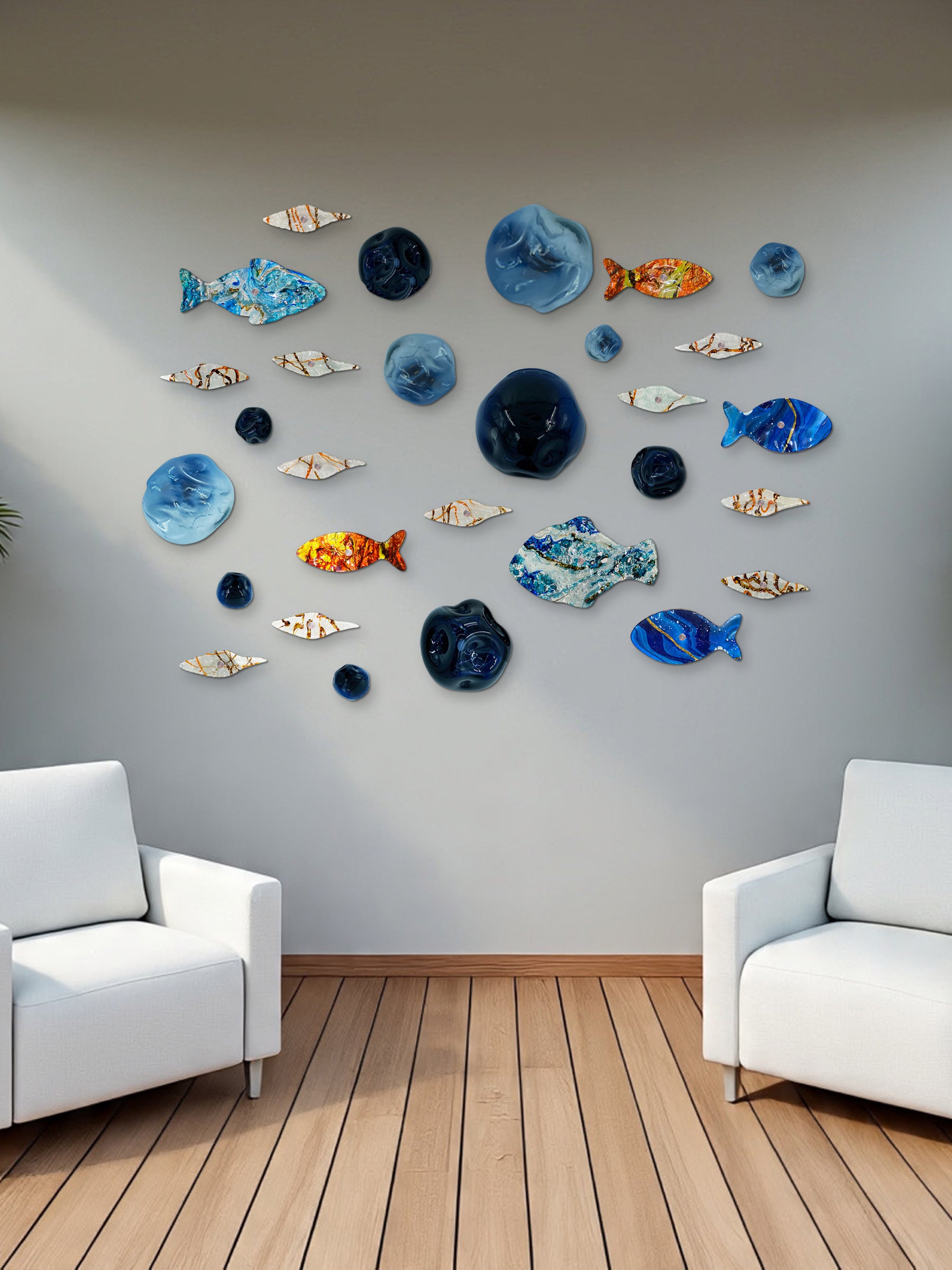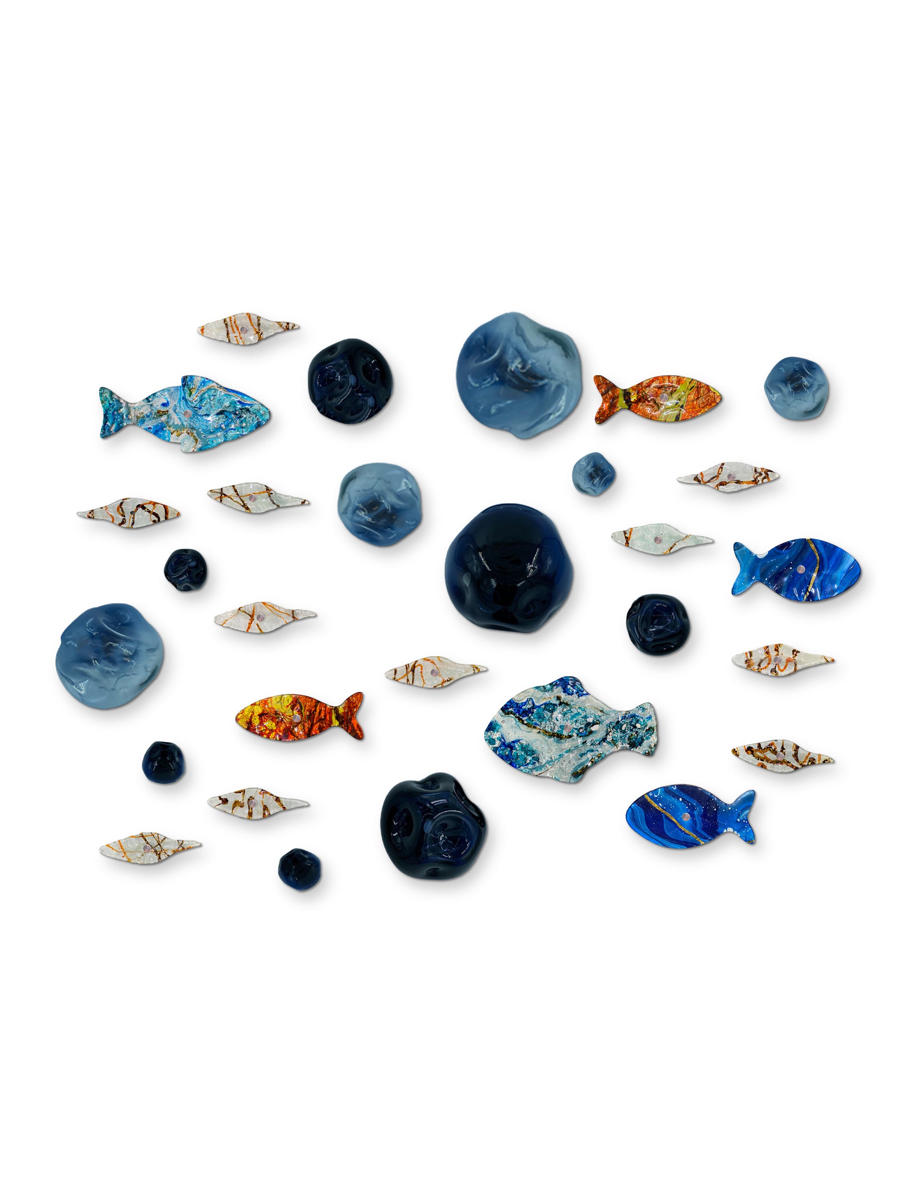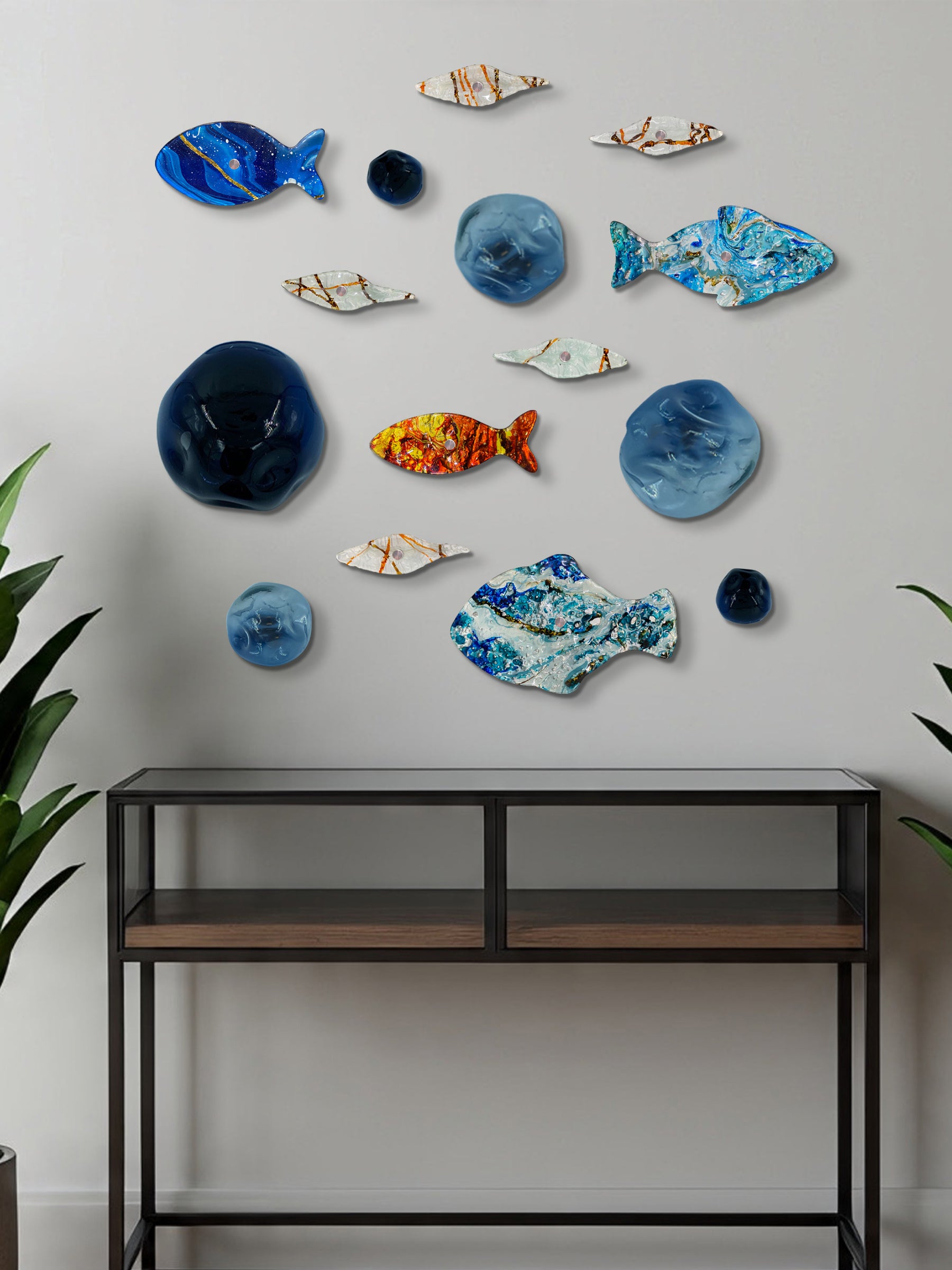 Set de vidrio soplado y termoformado con 40 piezas pintadas a mano a base de una técnica de resinas con bases para colocarlo en la pared.