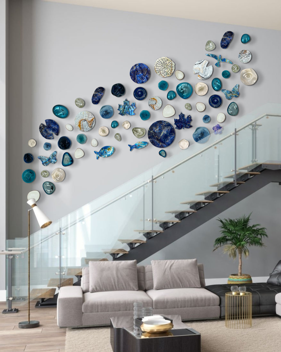 Set de vidrio soplado y termoformado con 64 piezas pintadas a mano a base de una técnica de resinas con bases para colocarlo en la pared.
