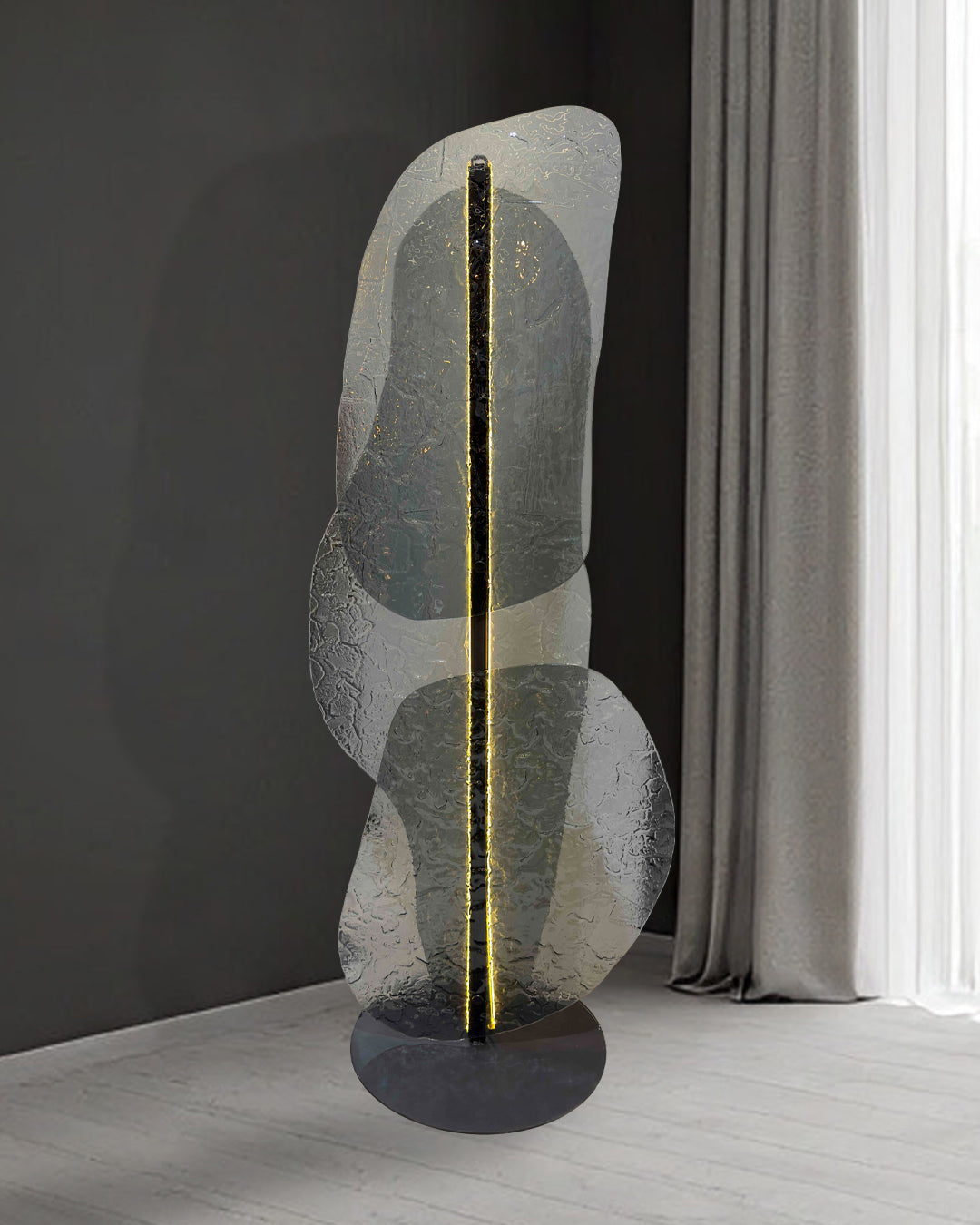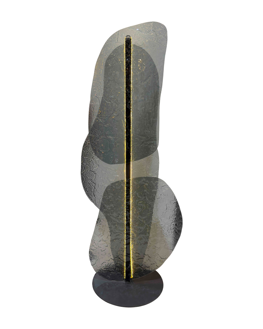 Piezas de vidrio de 6 mm termoformado en una base de metal negro mate a manera de escultura con tira de iluminación led.