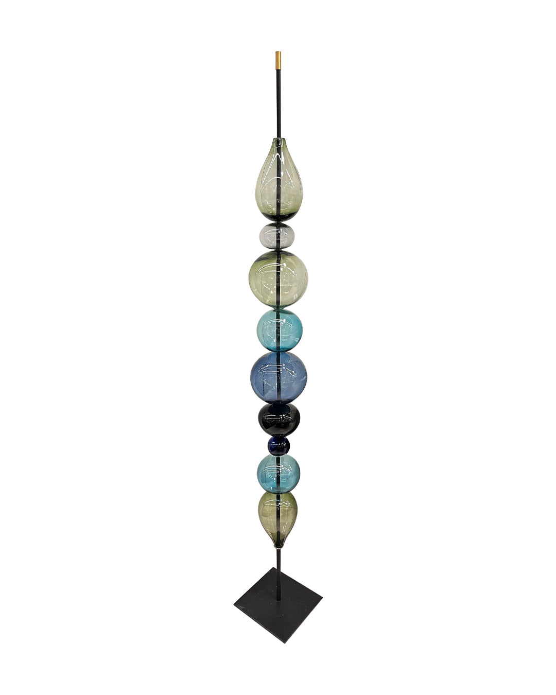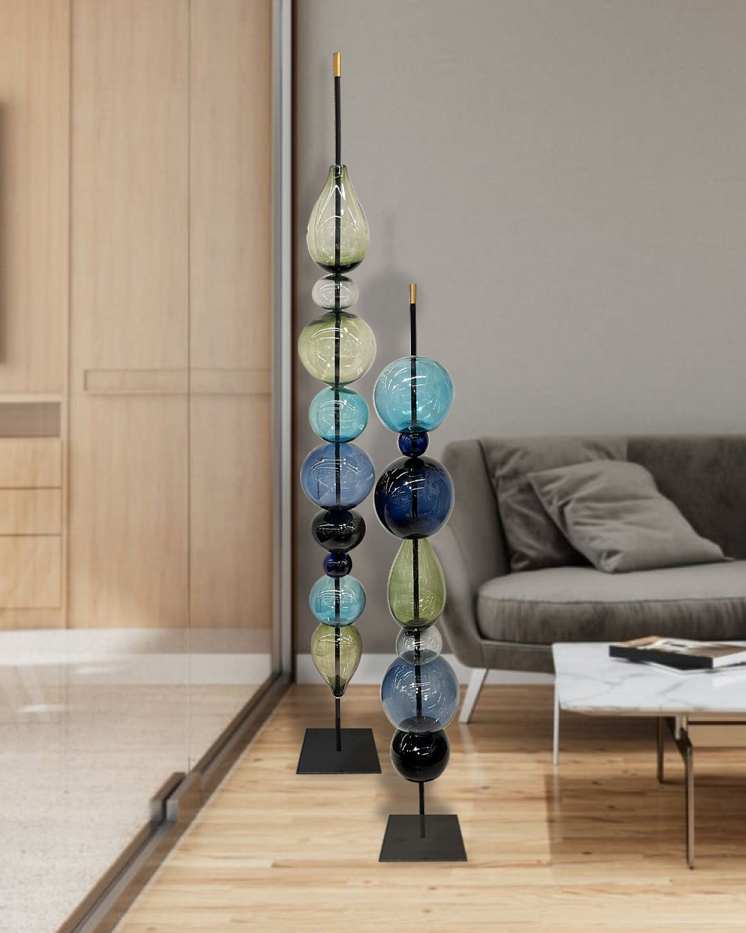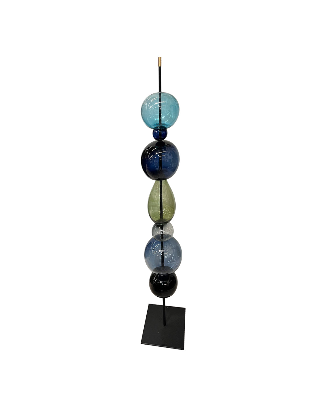 Piezas de vidrio soplado en una base de metal negro mate a manera de escultura con detalle de latón en la punta superior.