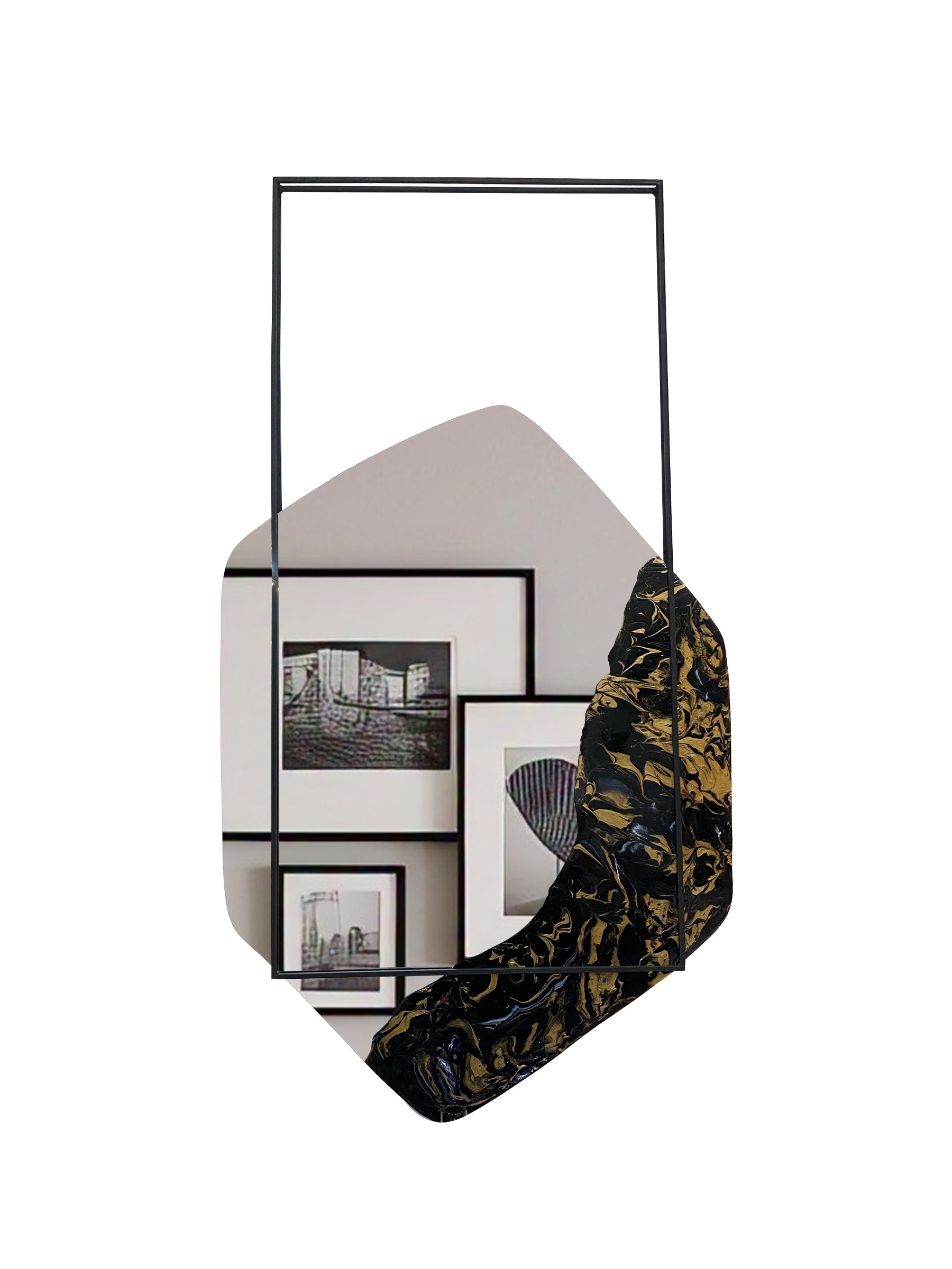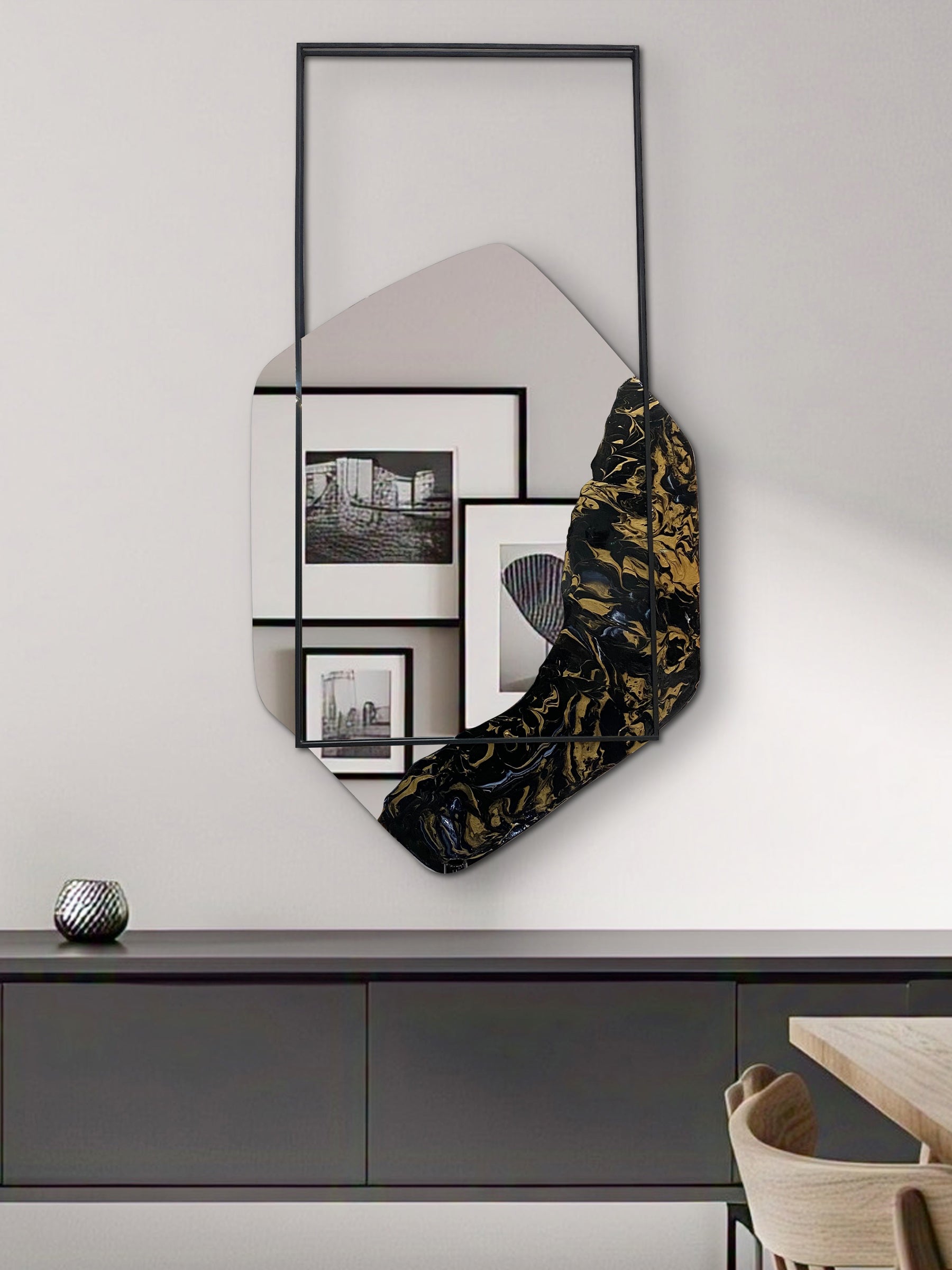 Nuestro espejo pintado a mano a base de una técnica de resinas, montado sobre una base de metal color negro mate, es perfecto para elevar la decoración de tu hogar con sus acabados y colores elegantes.