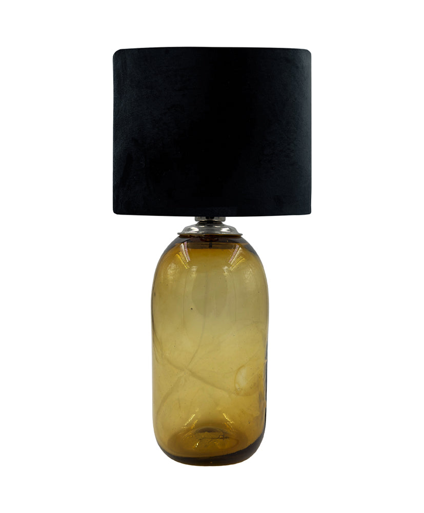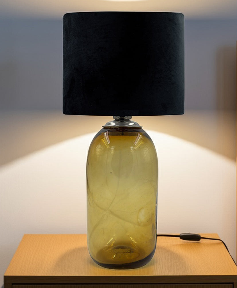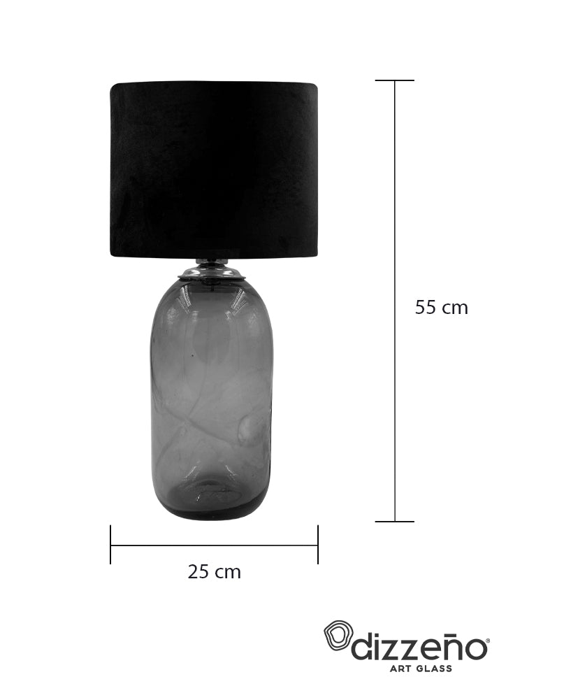 Lámpara moderna de vidrio soplado ideal para mesa de noche con elegante detalle de metal y pantalla de tela color negro, una excelente opción para iluminar tus espacios con una luz difusa que le da calidad al ambiente y es agradable en cualquier espacio.