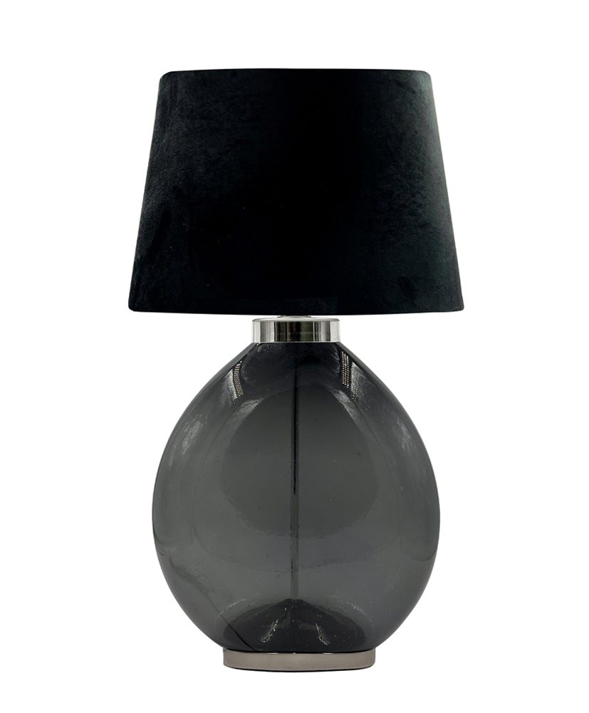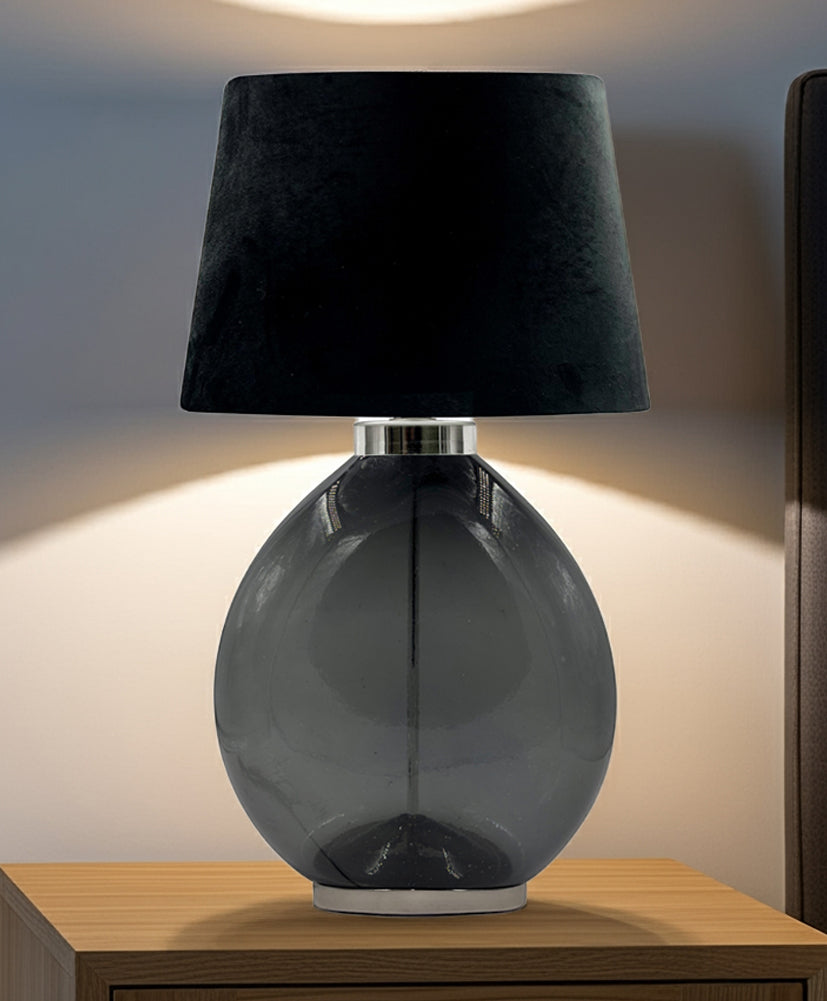 Lámpara moderna de vidrio soplado ideal para mesa de noche con elegante detalle de metal y pantalla de tela color negro, una excelente opción para iluminar tus espacios con una luz difusa que le da calidad al ambiente y es agradable en cualquier espacio.