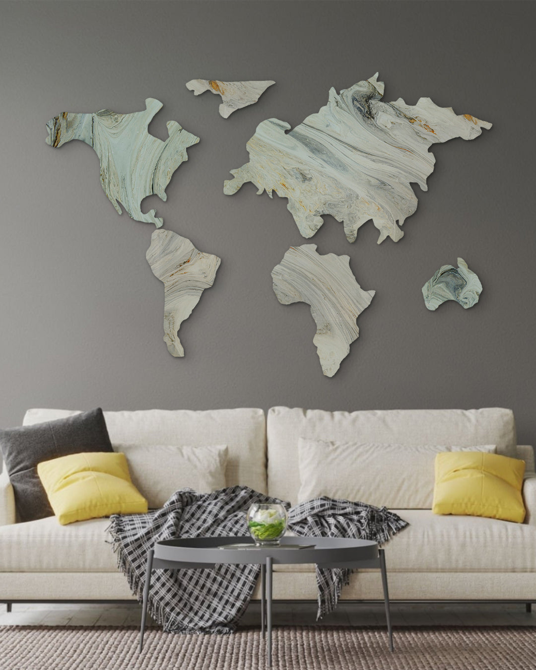 Mapa mundial con piezas de madera en corte láser pintadas a mano a base de una técnica de resinas.