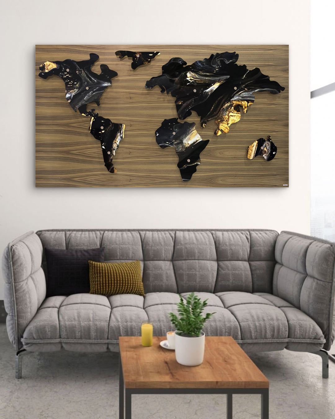 Mapa mundial con piezas de madera en corte láser pintadas a mano a base de una técnica de resinas, sobre... Leer más... Leer más...