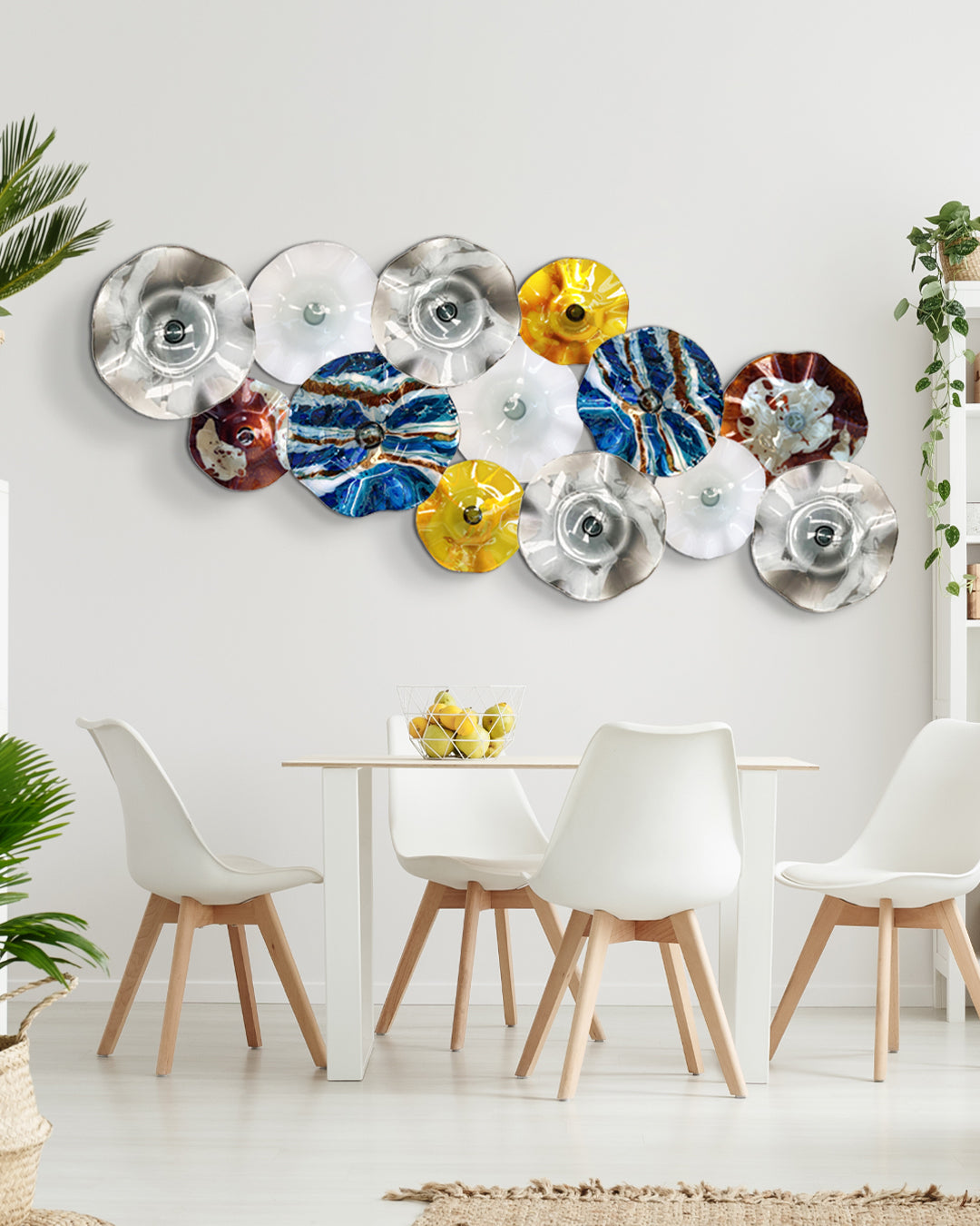 Con nuestro set de 13 platones de vidrio soplado podrás darle personalidad a tus espacios interiores gracias a sus distintas texturas y acabados originales, con sus diferentes combinaciones de color será posible crear ambientes especiales y visualmente atractivos que destacarán la belleza de su entorno en cualquier habitación, con la variación correcta destacarán la identidad de tu hogar.