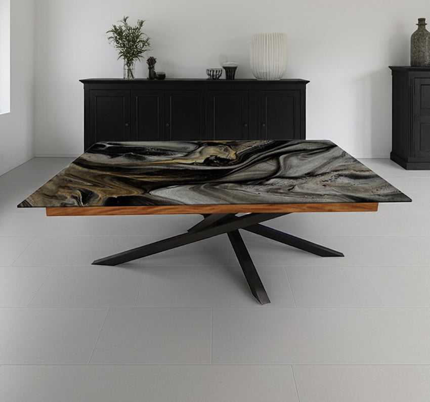 Elegante mesa de comedor con cubierta de vidrio pintado a mano a base de una técnica de resinas, cubrecanto interno de parota y patas de metal en color negro.
