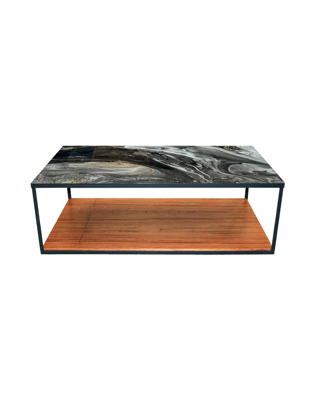 Elegante mesa decorativa de metal con cubierta superior de vidrio pintado a mano a base de una técnica de resinas y cubierta inferior de madera.