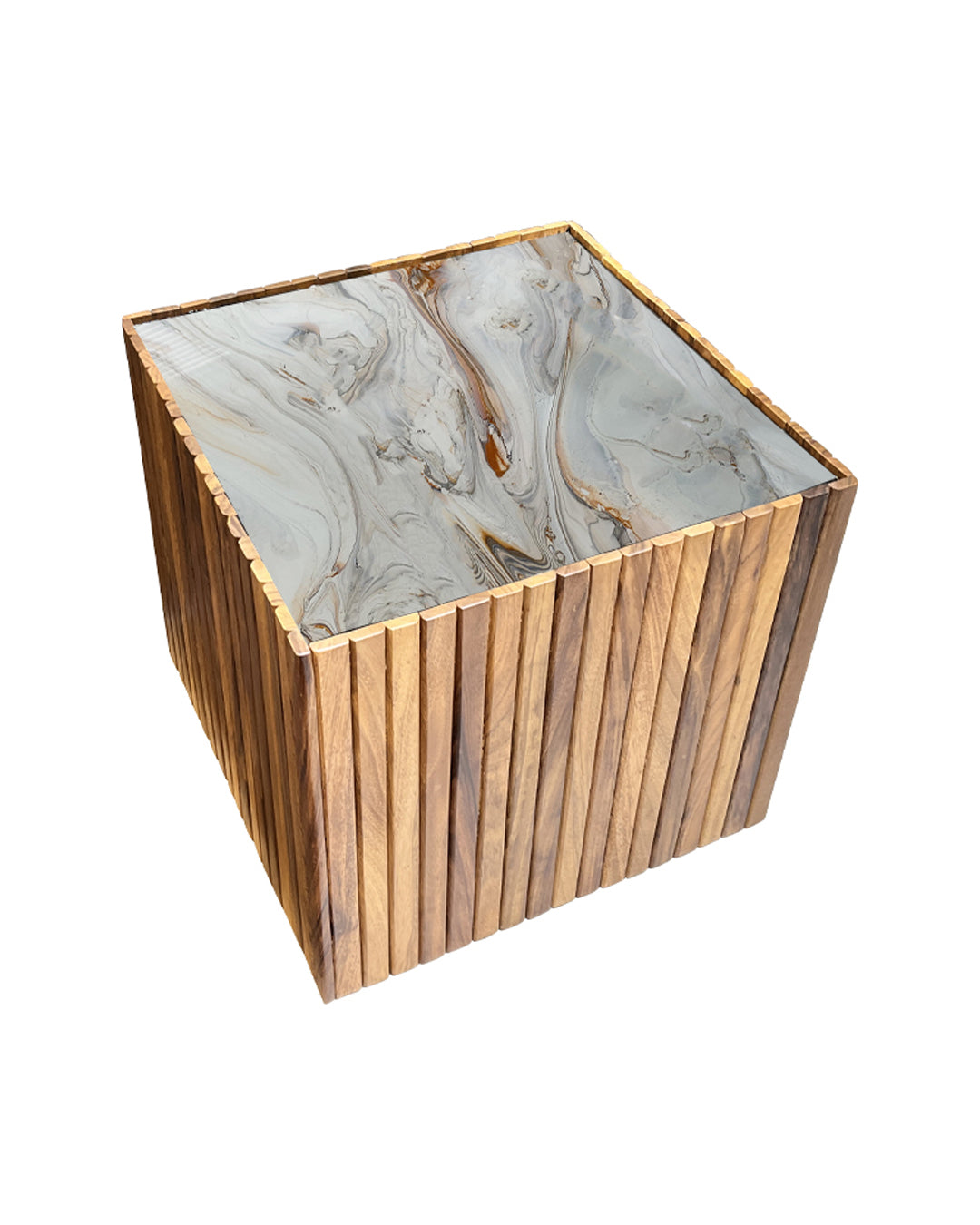 Elegante mesa decorativa de parota con cubierta de vidrio pintado a mano a base de una técnica de resinas.
