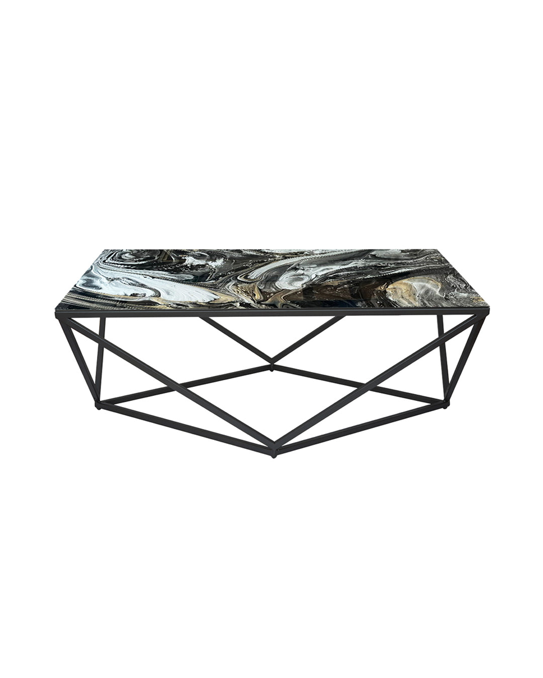 Elegante mesa decorativa de metal con cubierta de vidrio pintado a mano a base de una técnica de resinas.