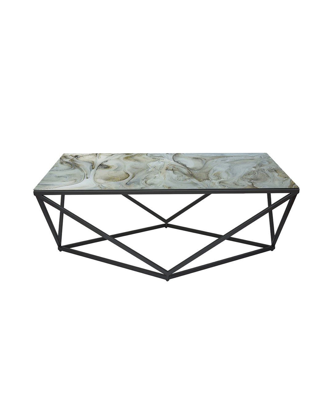 Elegante mesa decorativa de metal con cubierta de vidrio pintado a mano a base de una técnica de resinas.