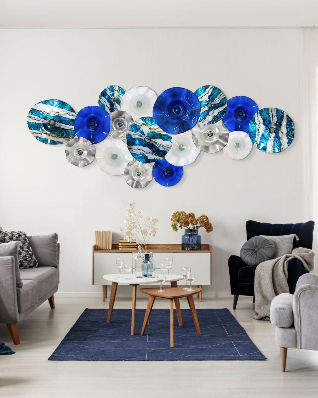 Con nuestro set de 17 platones de vidrio soplado podrás darle personalidad a tus espacios interiores gracias a sus distintas texturas y acabados originales, con sus diferentes combinaciones de color será posible crear ambientes especiales y visualmente atractivos que destacarán la belleza de su entorno en cualquier habitación, con la variación correcta destacarán la identidad de tu hogar.