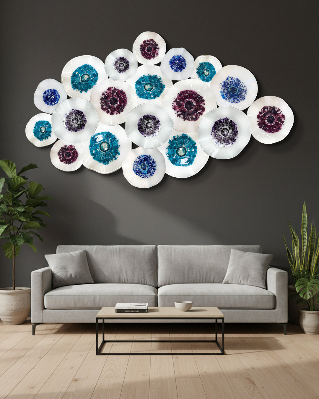 Con nuestro set de 19 platones de vidrio soplado podrás darle personalidad a tus espacios interiores gracias a sus distintas texturas y acabados originales, con sus diferentes combinaciones de color será posible crear ambientes especiales y visualmente atractivos que destacarán la belleza de su entorno en cualquier habitación, con la variación correcta destacarán la identidad de tu hogar.