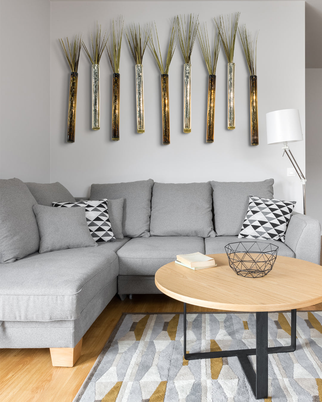 9 Cilindros de vidrio soplado pintado a mano con bases individuales de metal.