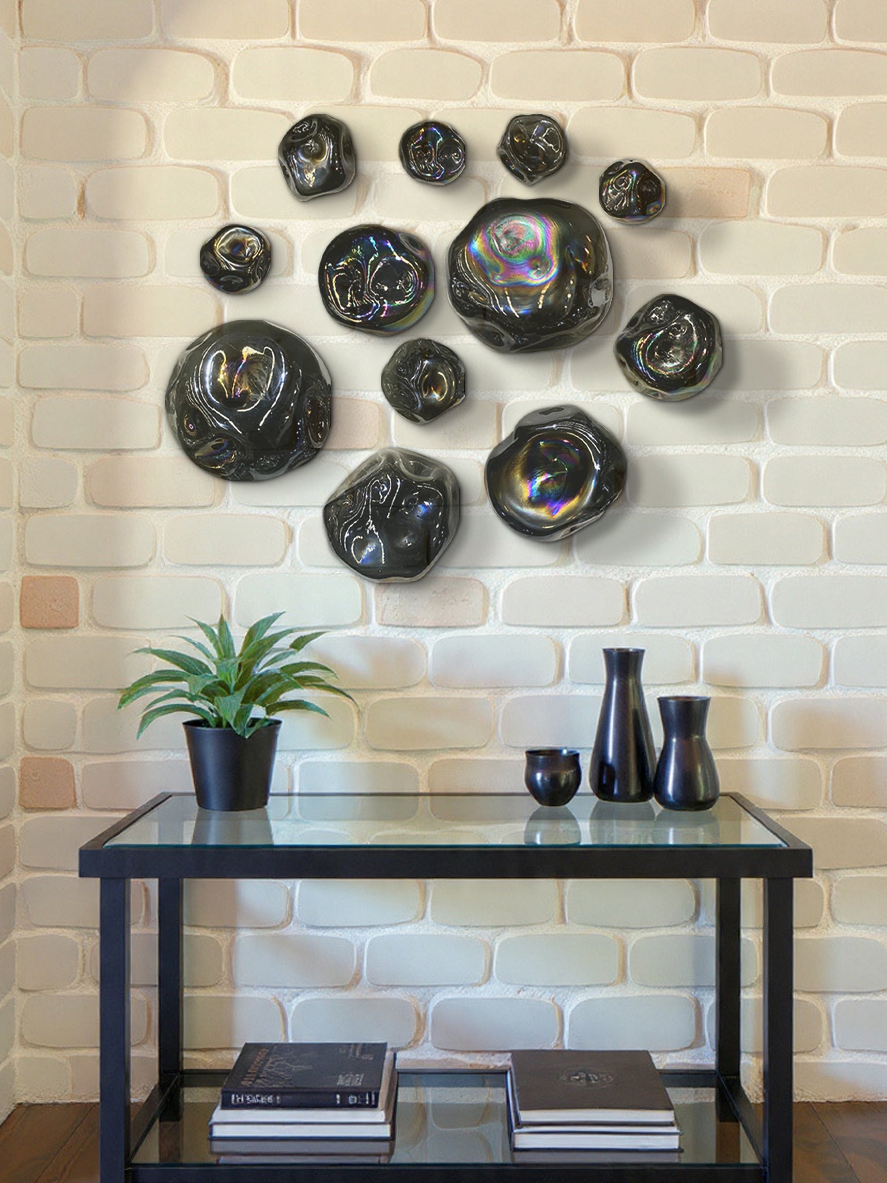 Esferas deformes de vidrio soplado pintado a mano con bases individuales de metal.