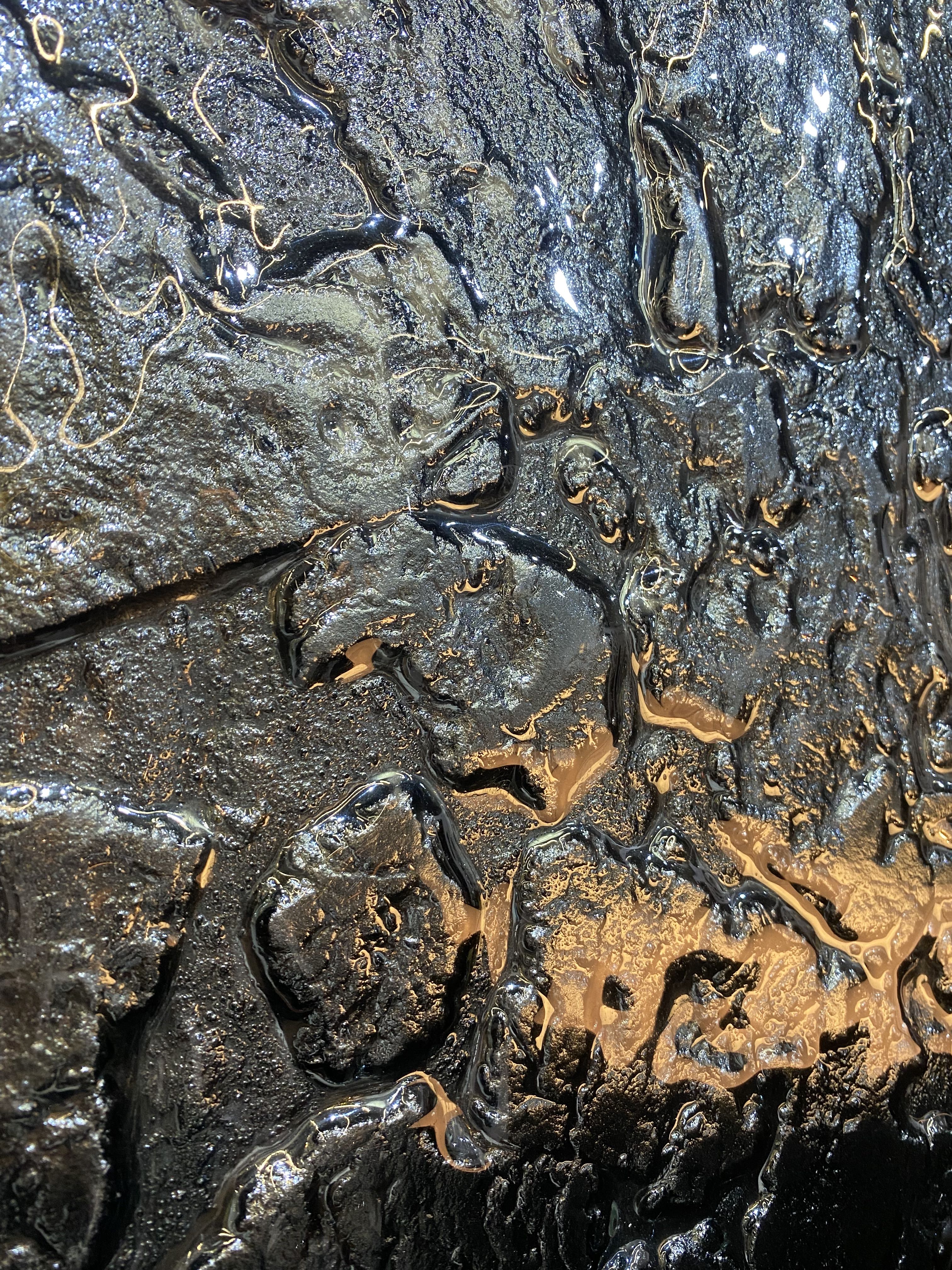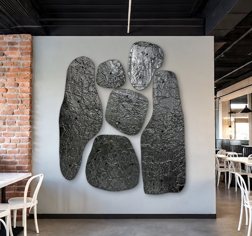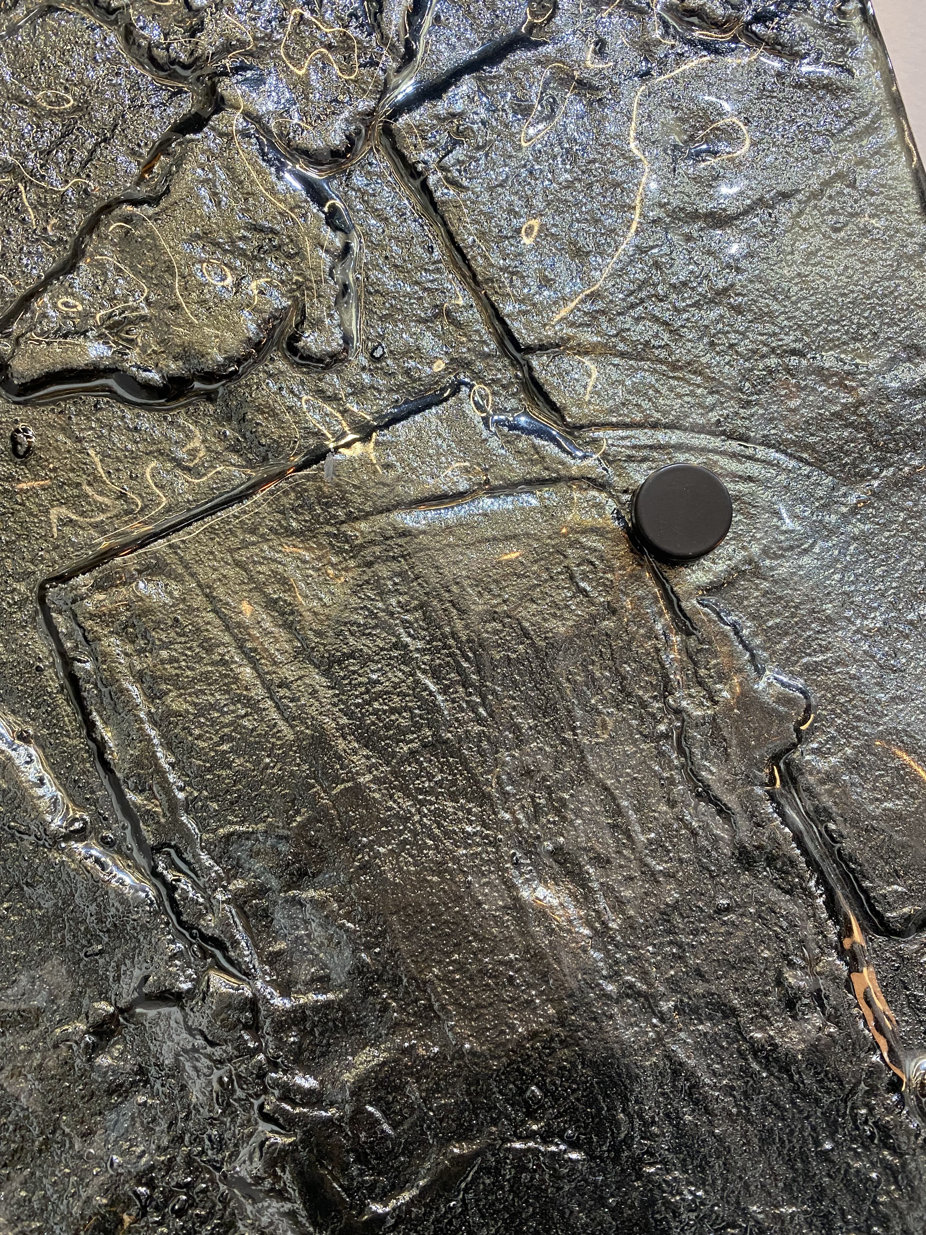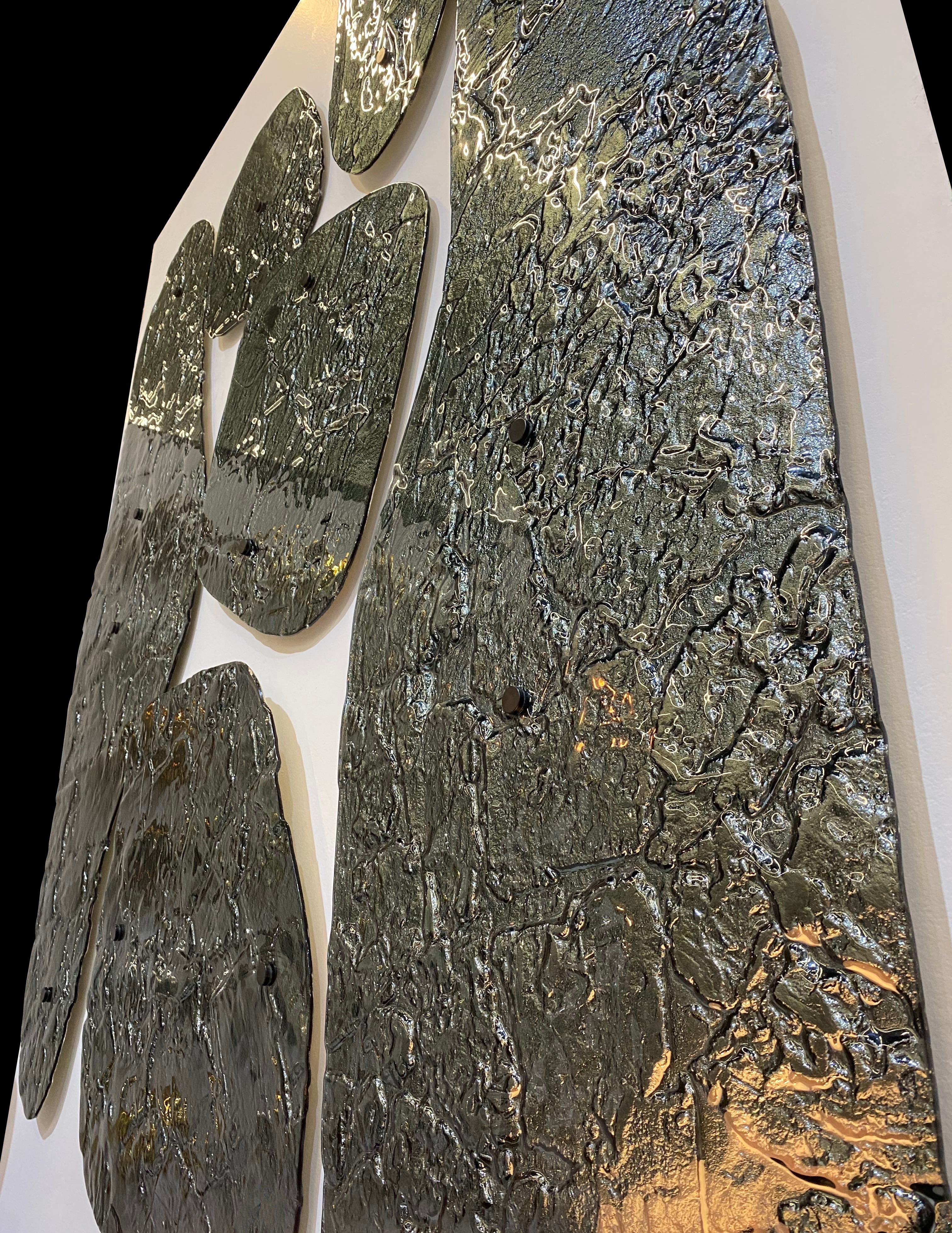 Piezas de vidrio termoformado pintado a mano con chapetones de acero inoxidable.