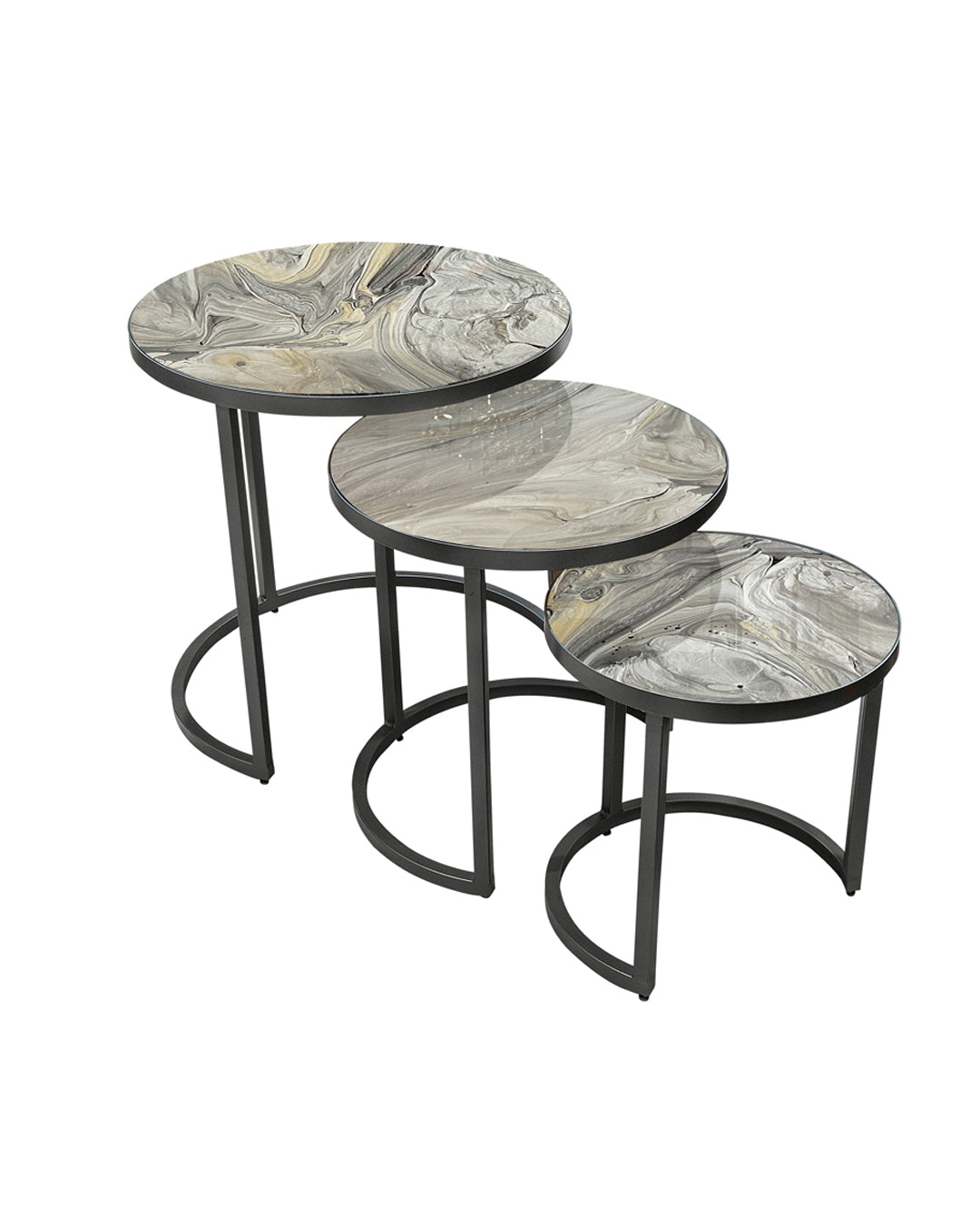 Elegante set de mesas decorativas de metal con cubierta de vidrio pintado a mano a base de una técnica de resinas.
