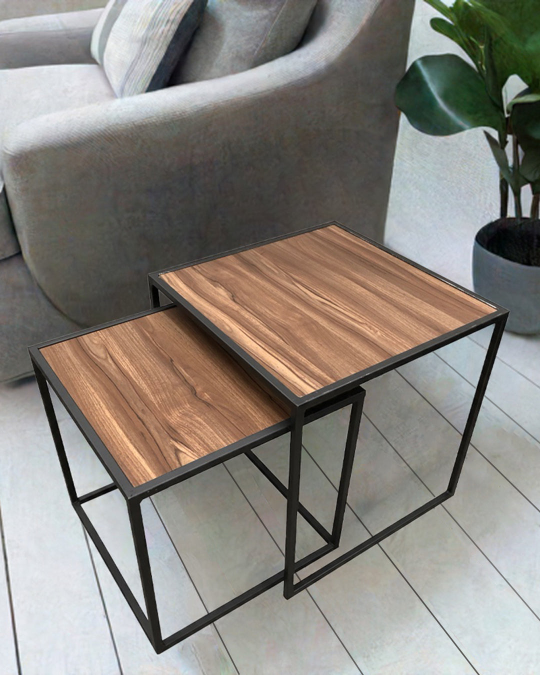 Elegante set de mesas decorativas de metal con cubierta de madera.